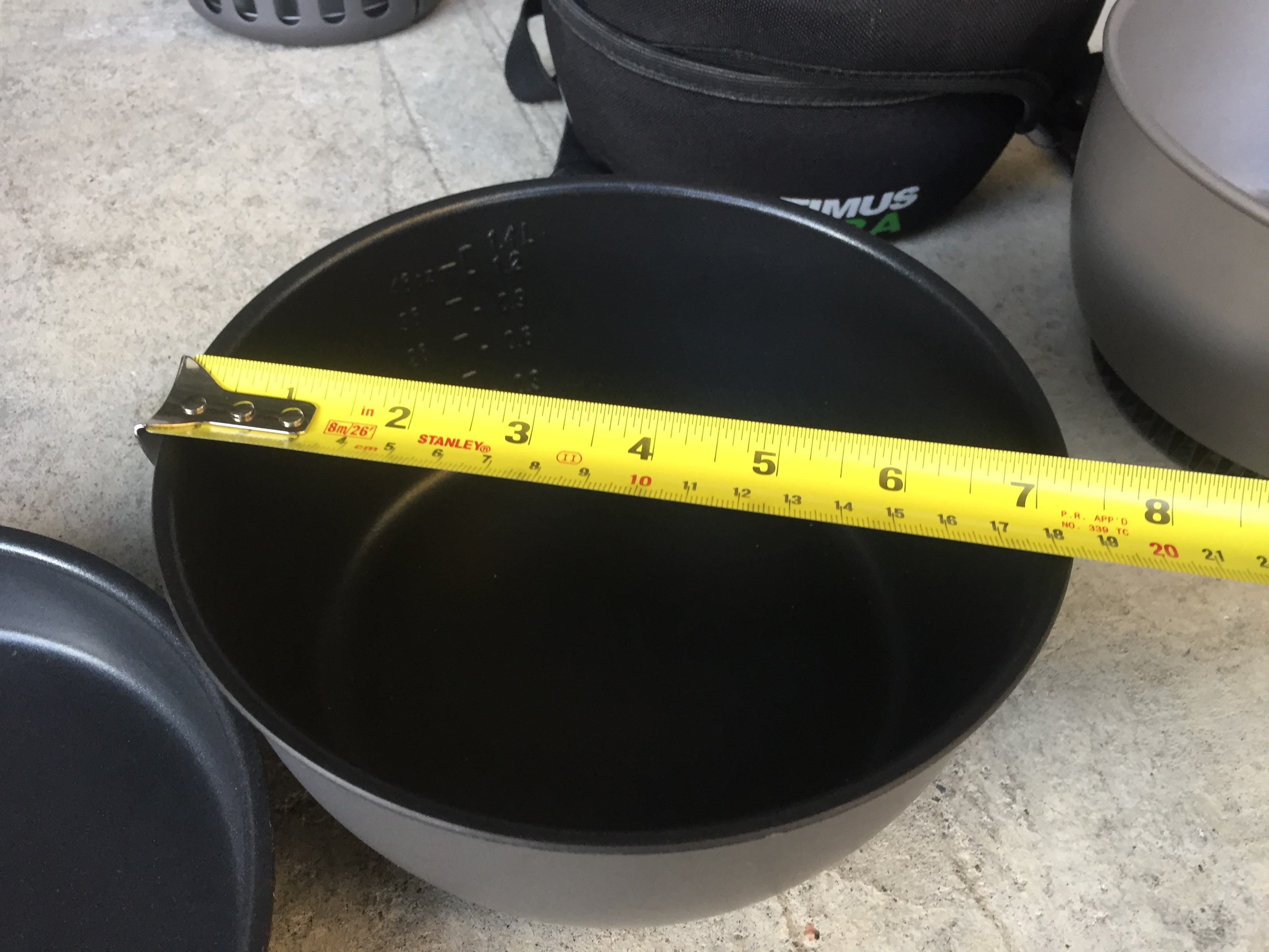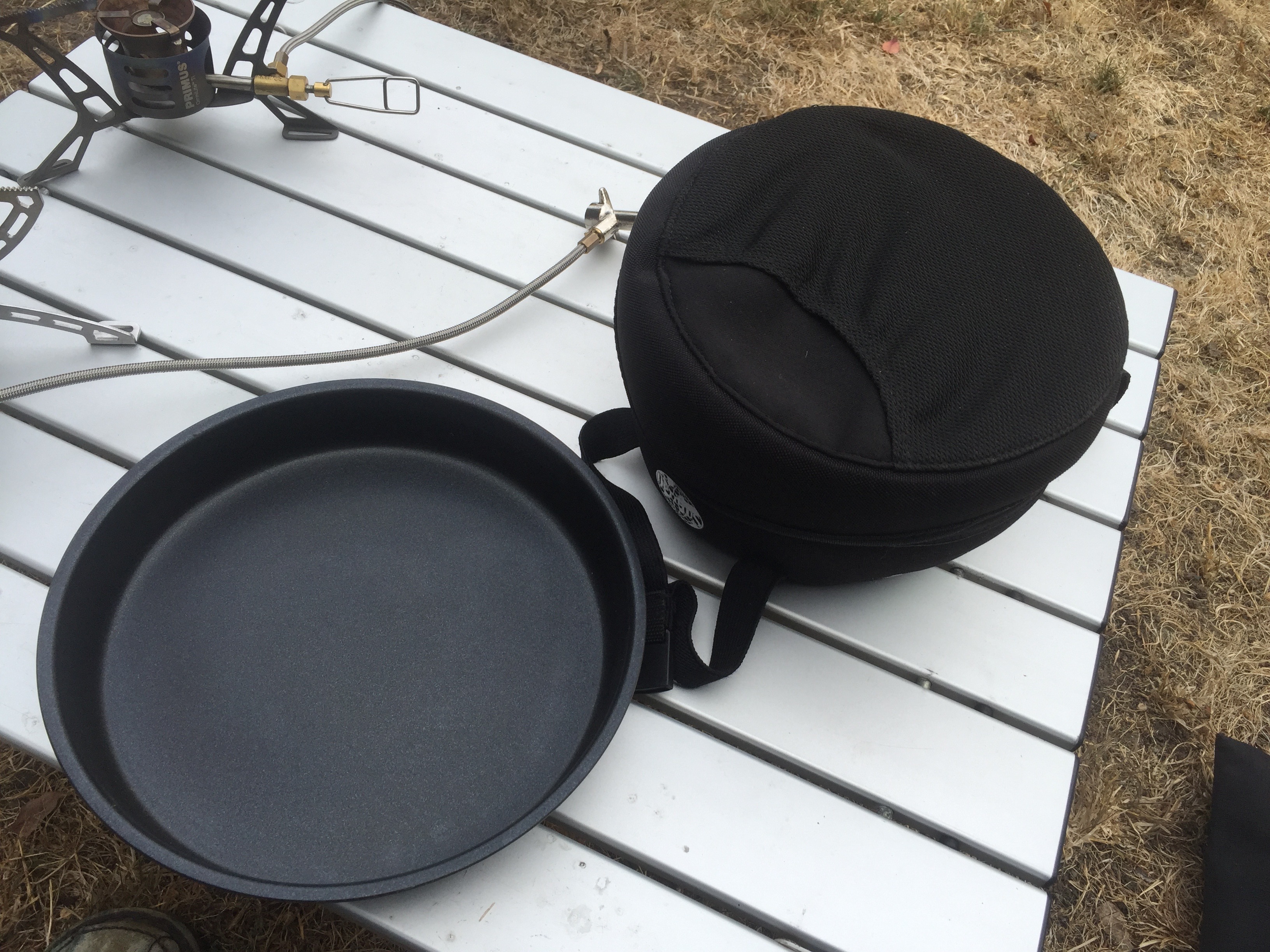 A good way to use this setup seems to be: Leave the coated pot in the neopreme bag, cook with the HE pot, transfer to the coated pot before starting the next thing, and close the neoprene cover to keep the food in the coated pot warm. For boiling water, the pan makes a nice cover. Covering the pot with the pan base-side-down is a little easier as you can use the pot gripper to grab the pan when needed. Anything splashing up from inside the pot may get the outer base of the pan dirty, but that’s not a big deal and I don’t worry about scrubbing that side.