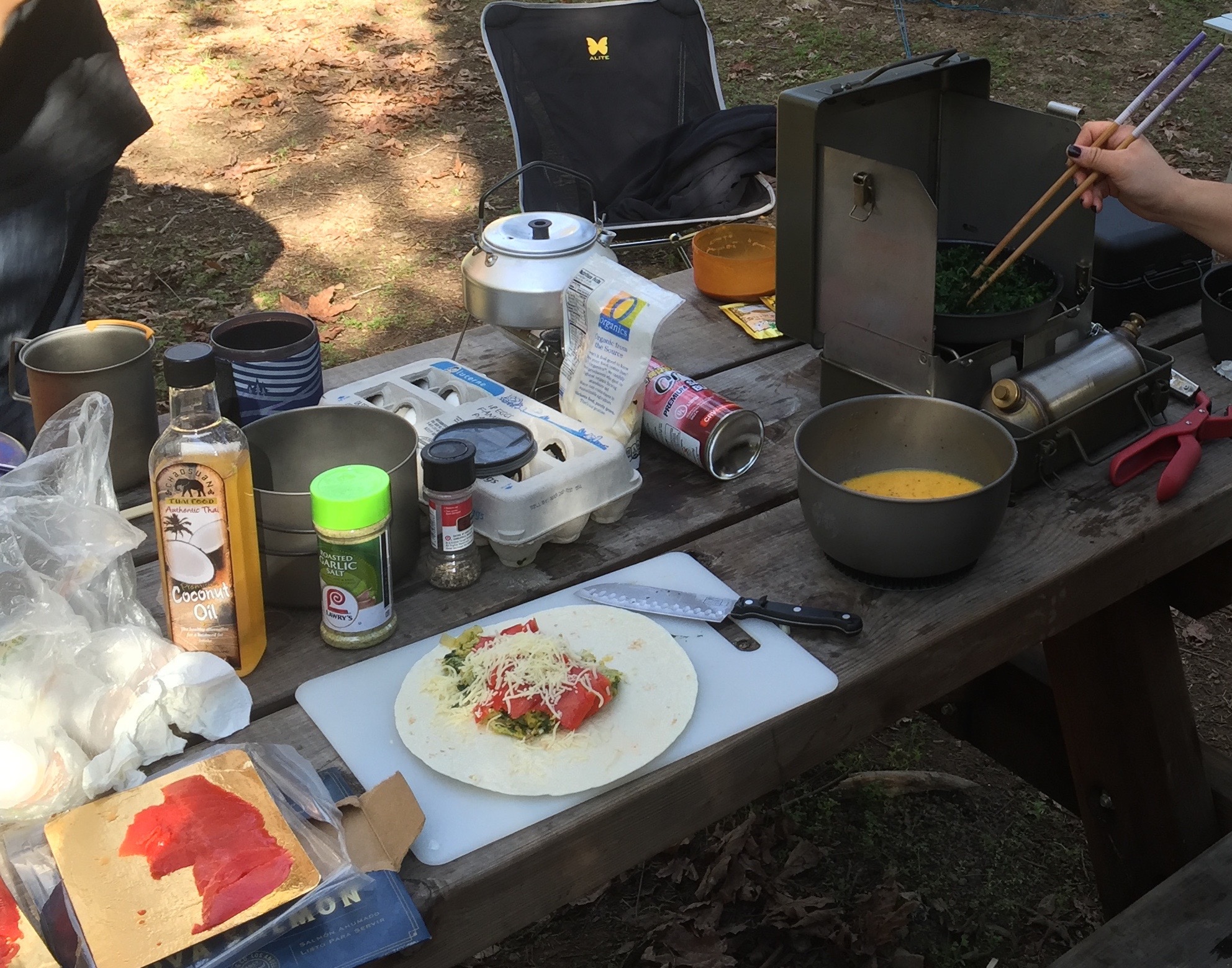 Okay, the Snoopy bowl and metal silverware isn’t backpacking gear, but, other than that, pretty good little experiment.
