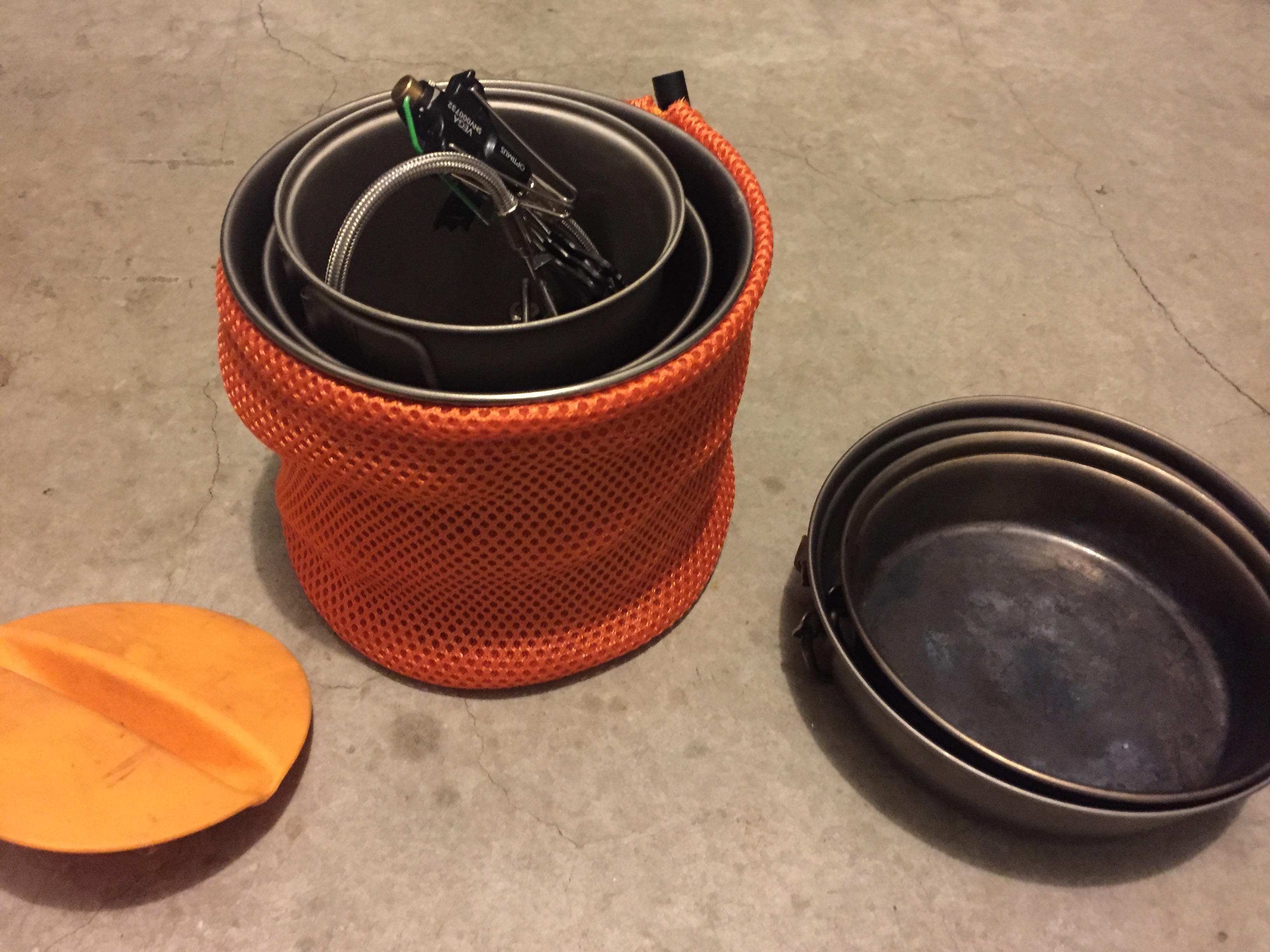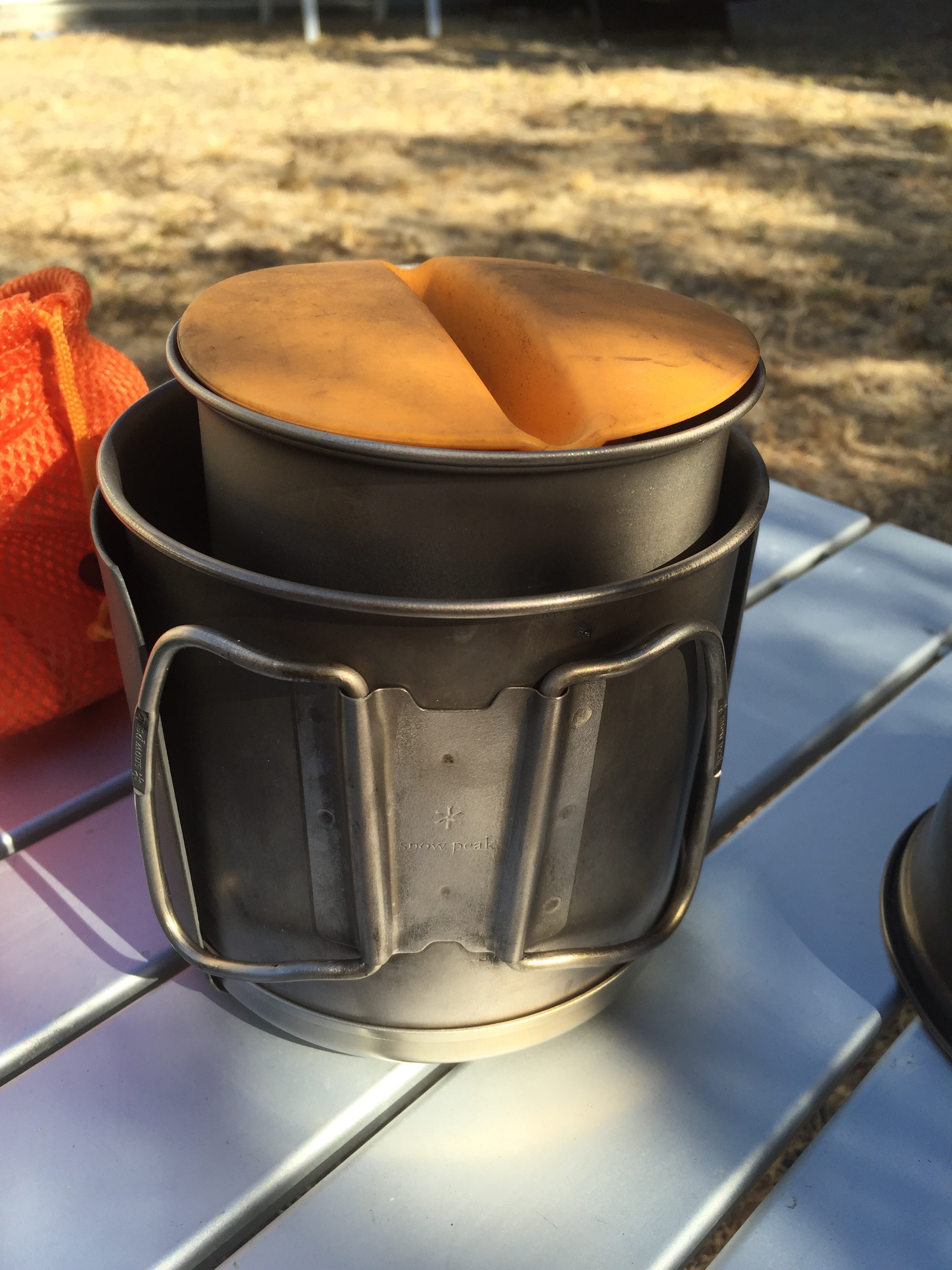 Here it is paired with the Optimus HE Weekend pot and pan, with a Trangia Alcohol stove and an Evernew cross bar pot stand (not shown). Some may notice that there’s also a silicone pot gripper in the cup from the GSI Halulite mug….dunno how it got there, hahaha.