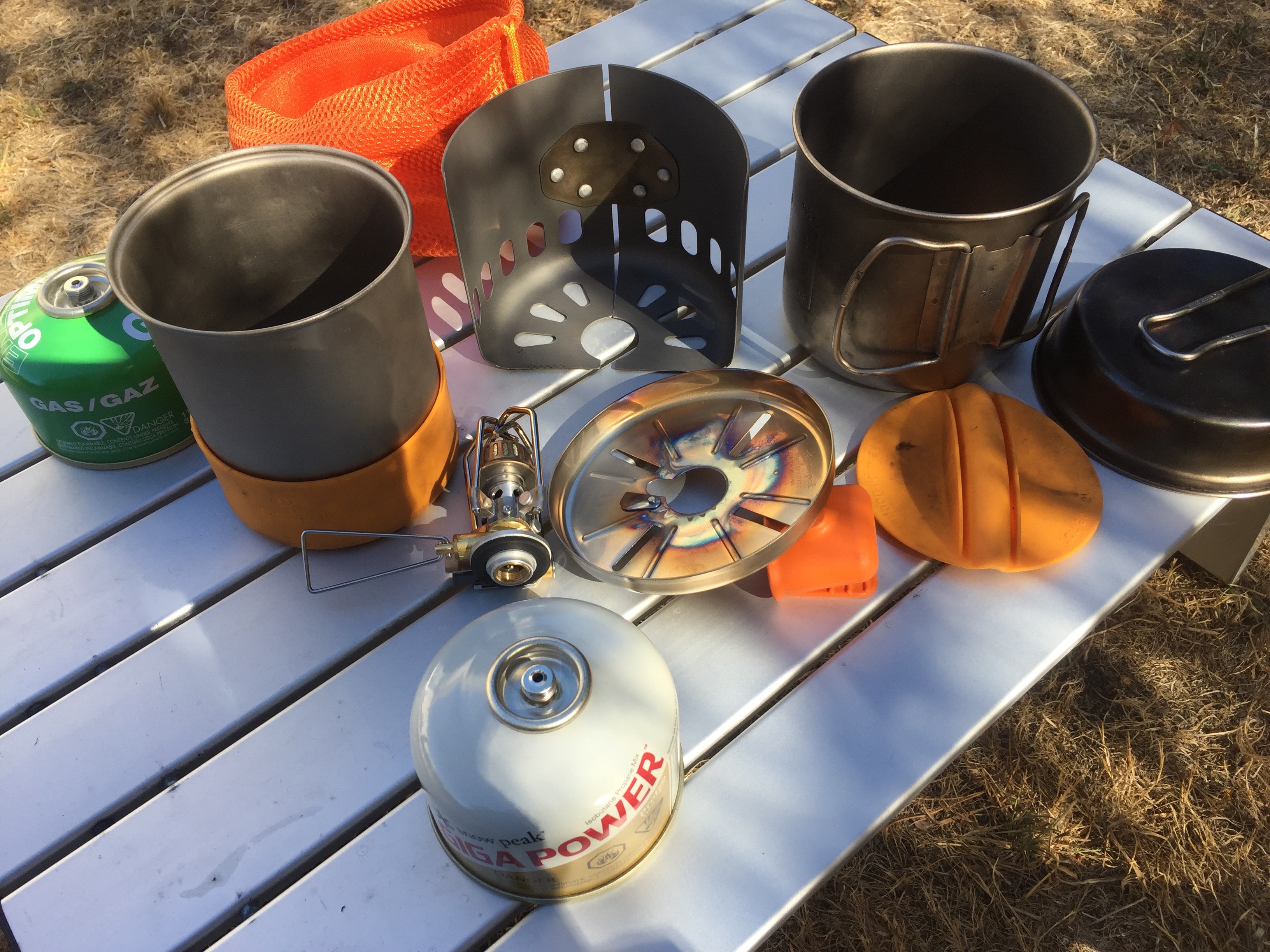 As a bit of an homage to Snow Peak, this setup is my current day hike setup. It’s basically the GigaPower, the GigaPower windshield, the Optimus windshield, the Snow Peak 900, and the Hybrid Summit. In terms of heat efficiency, it’s okay. 2 cups of water take about 4 minutes or so on a full LPG, which translates to about 10 uses. I can switch out the GigaPower with the LiteMax, but it doesn’t really improve water boil time that much.