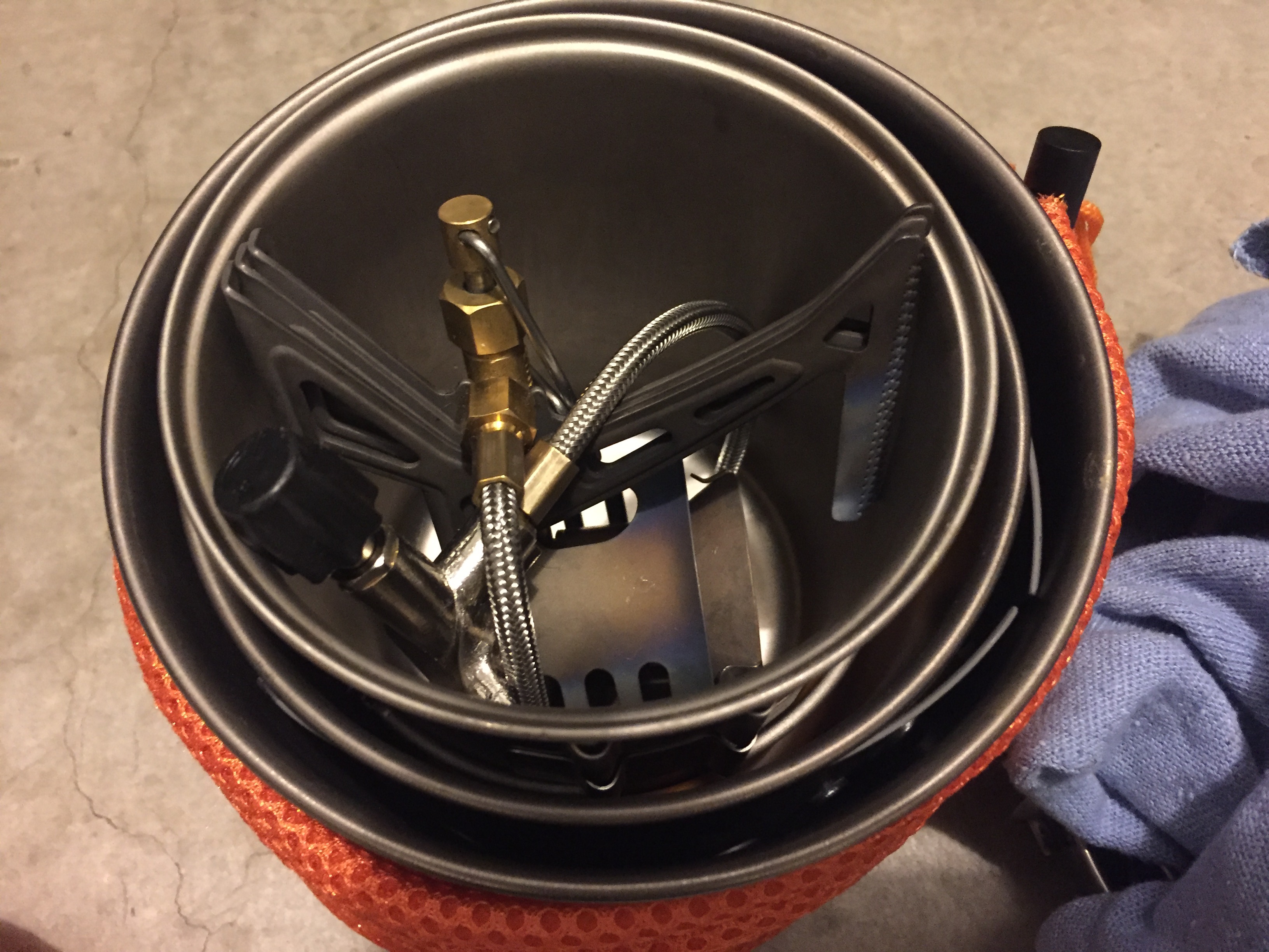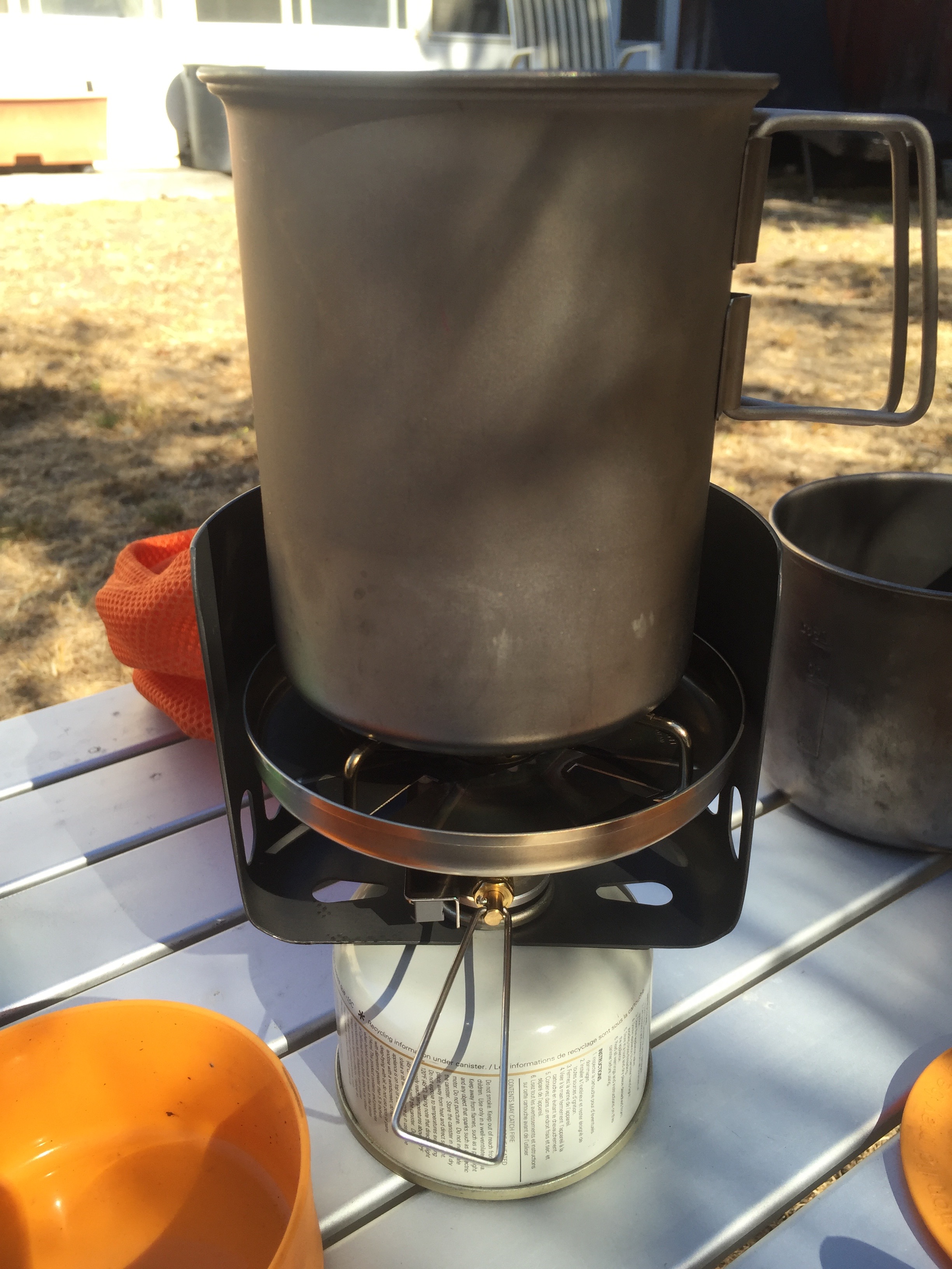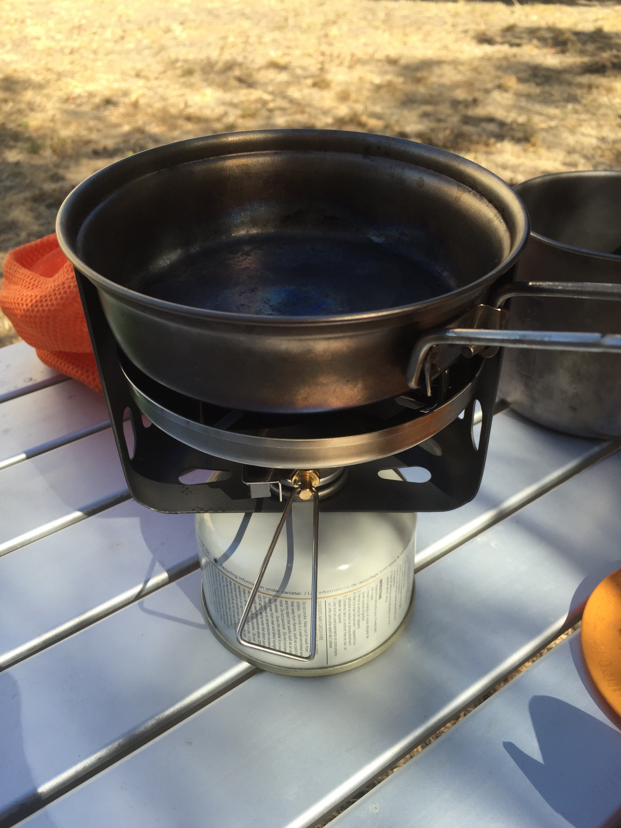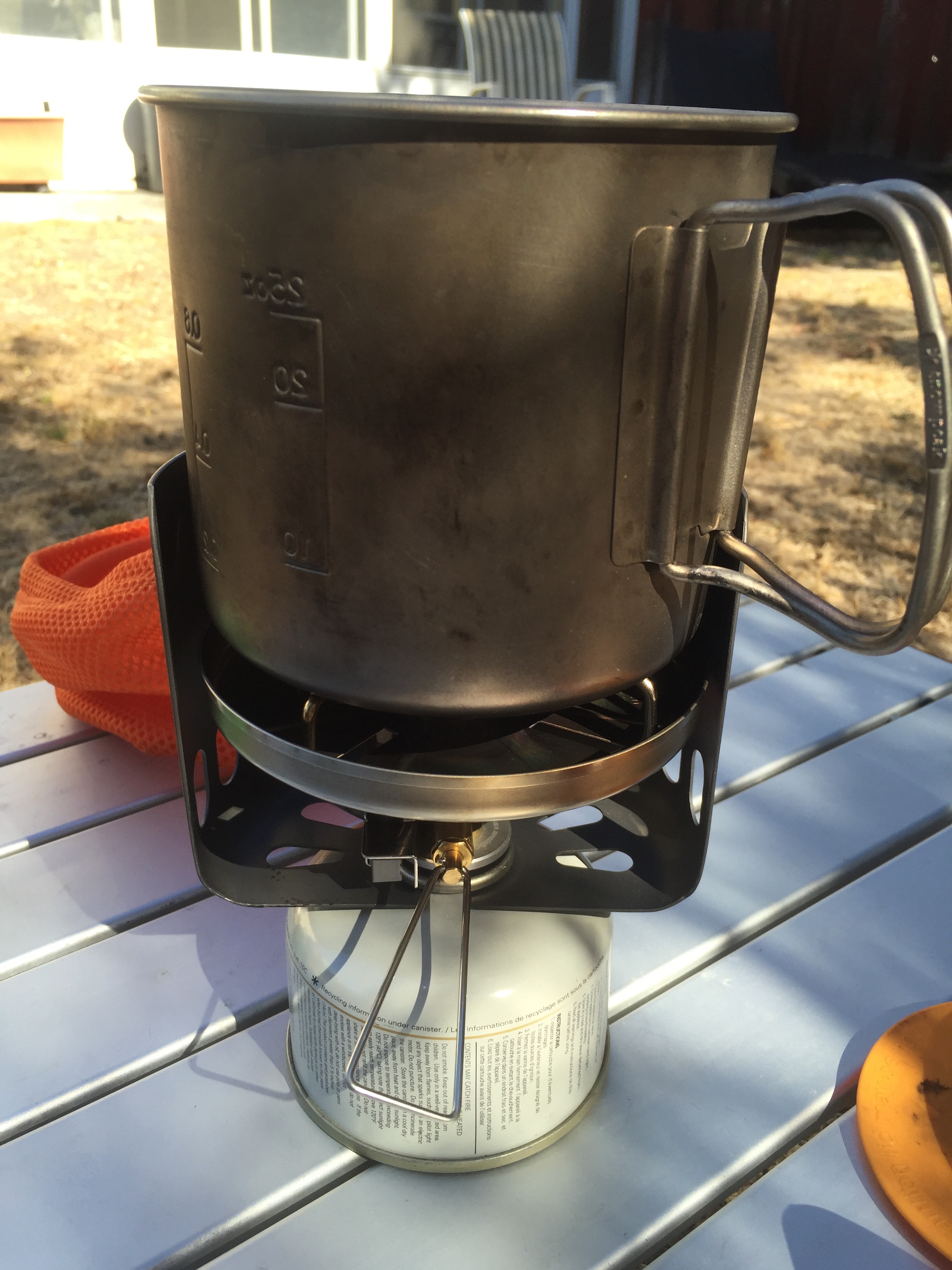 It’s a tough little setup, and while not as efficient with fuel as a JetBoil, it has the flexibility of being able to cook with a fry pan or sauce pan, while keeping the main cup free for coffee.
