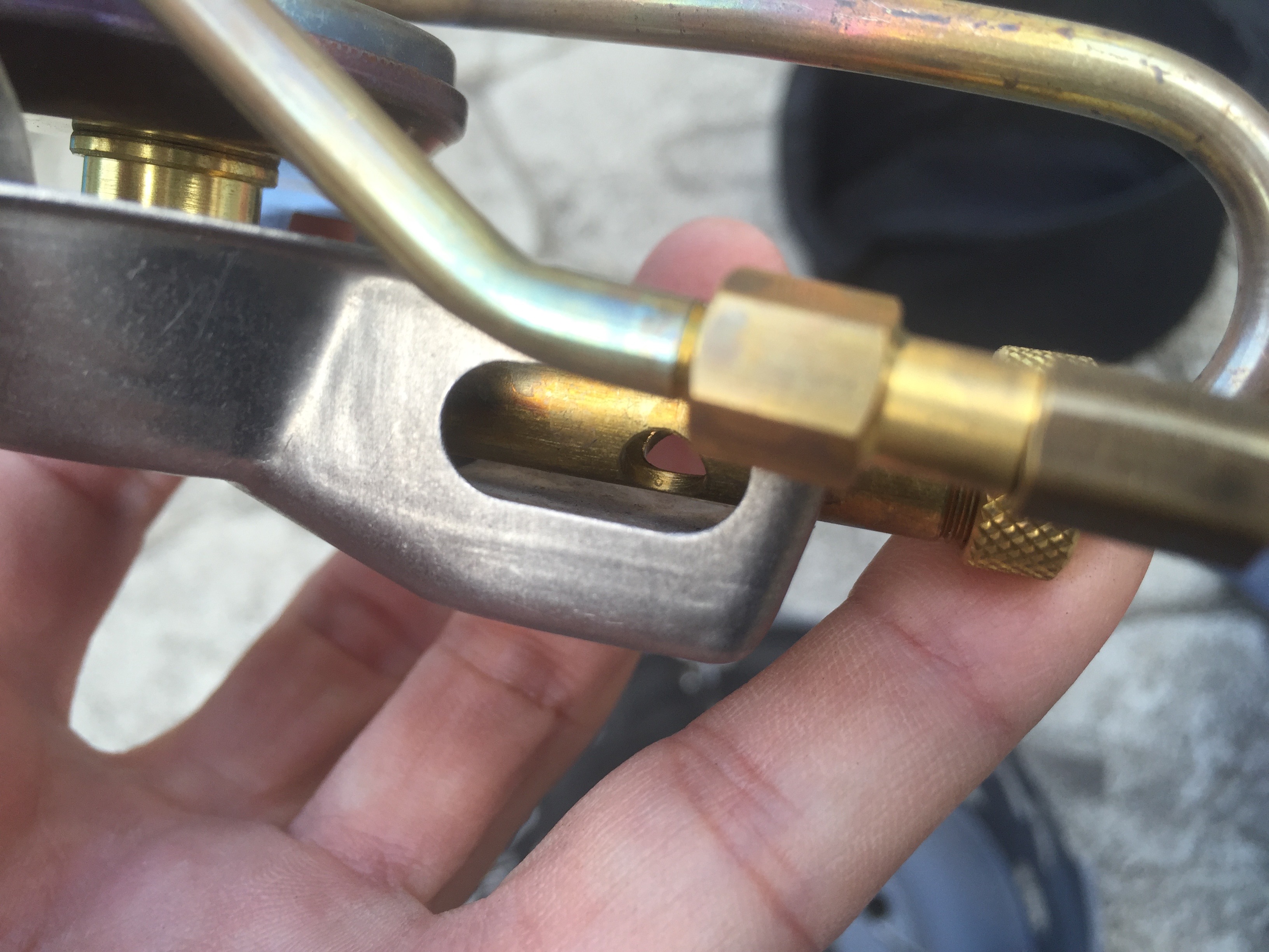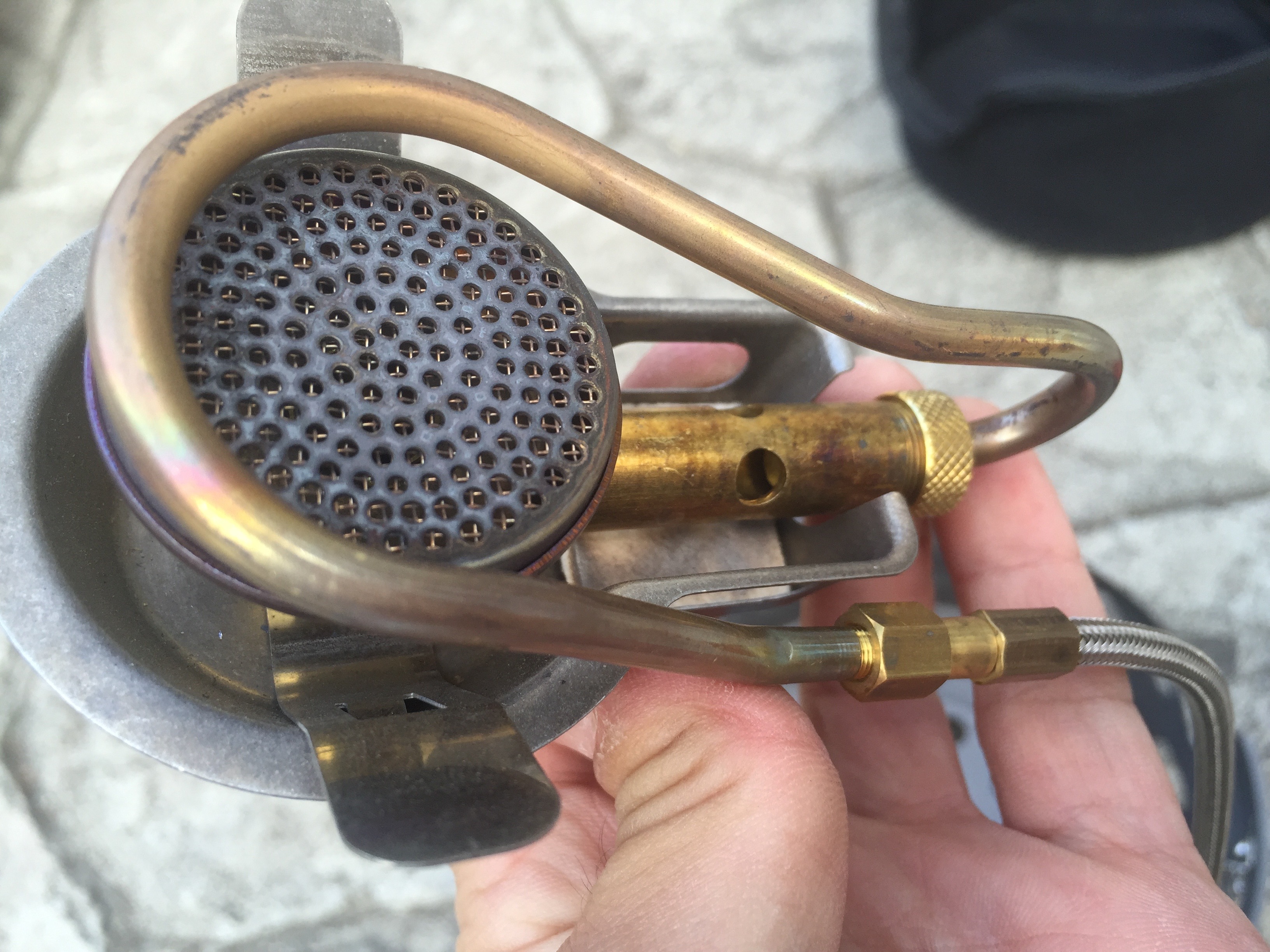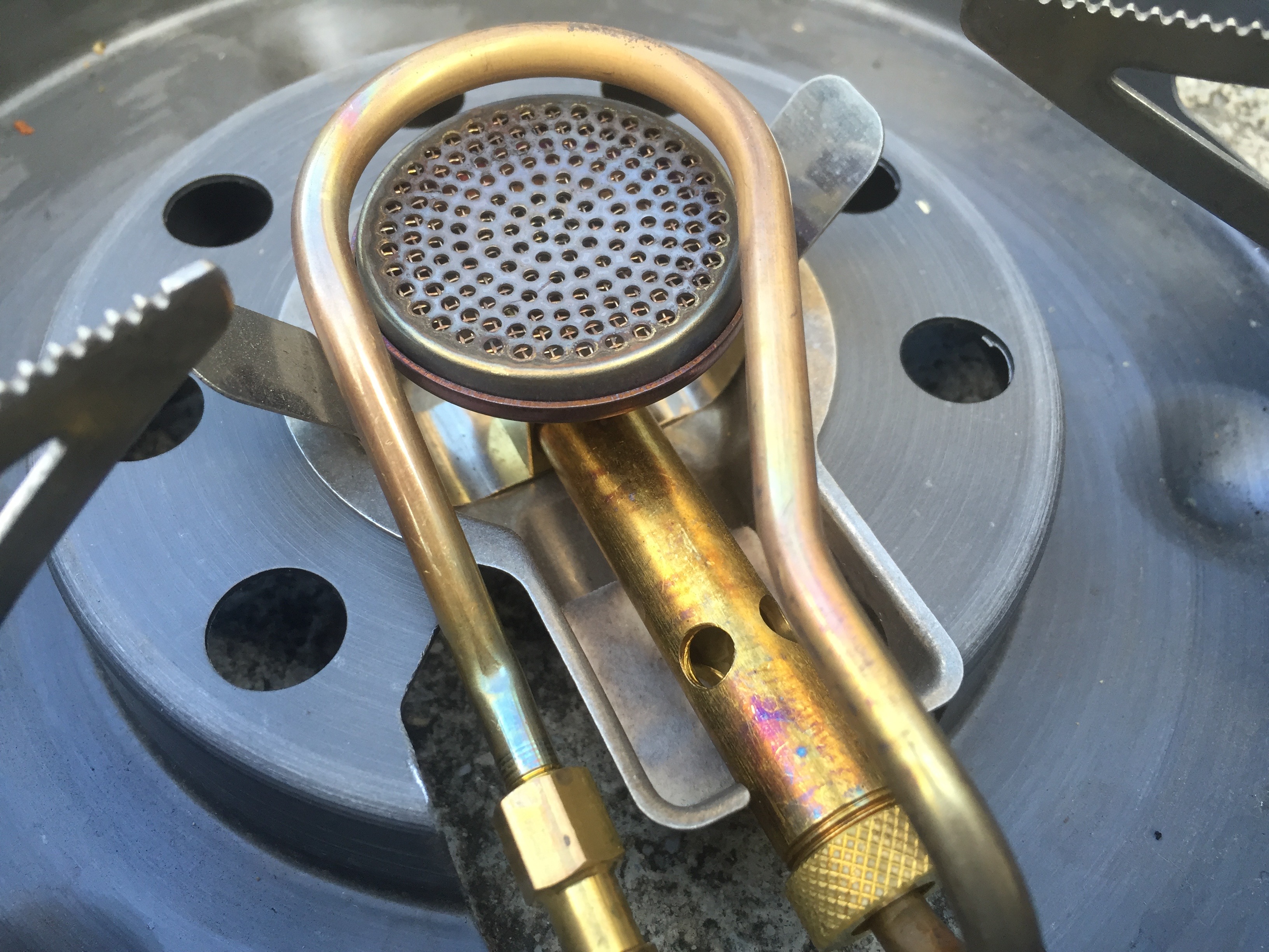 More interestingly, notice in the second photo about, the outer steel casing has a little drop, creating a little bowl beneath injector rod. That little bowl is to hold pre-heating liquid. If you’re familiar with liquid fuel stoves, pre-heating is a typically required pre-step for using white gas, kerosene, diesel, etc.