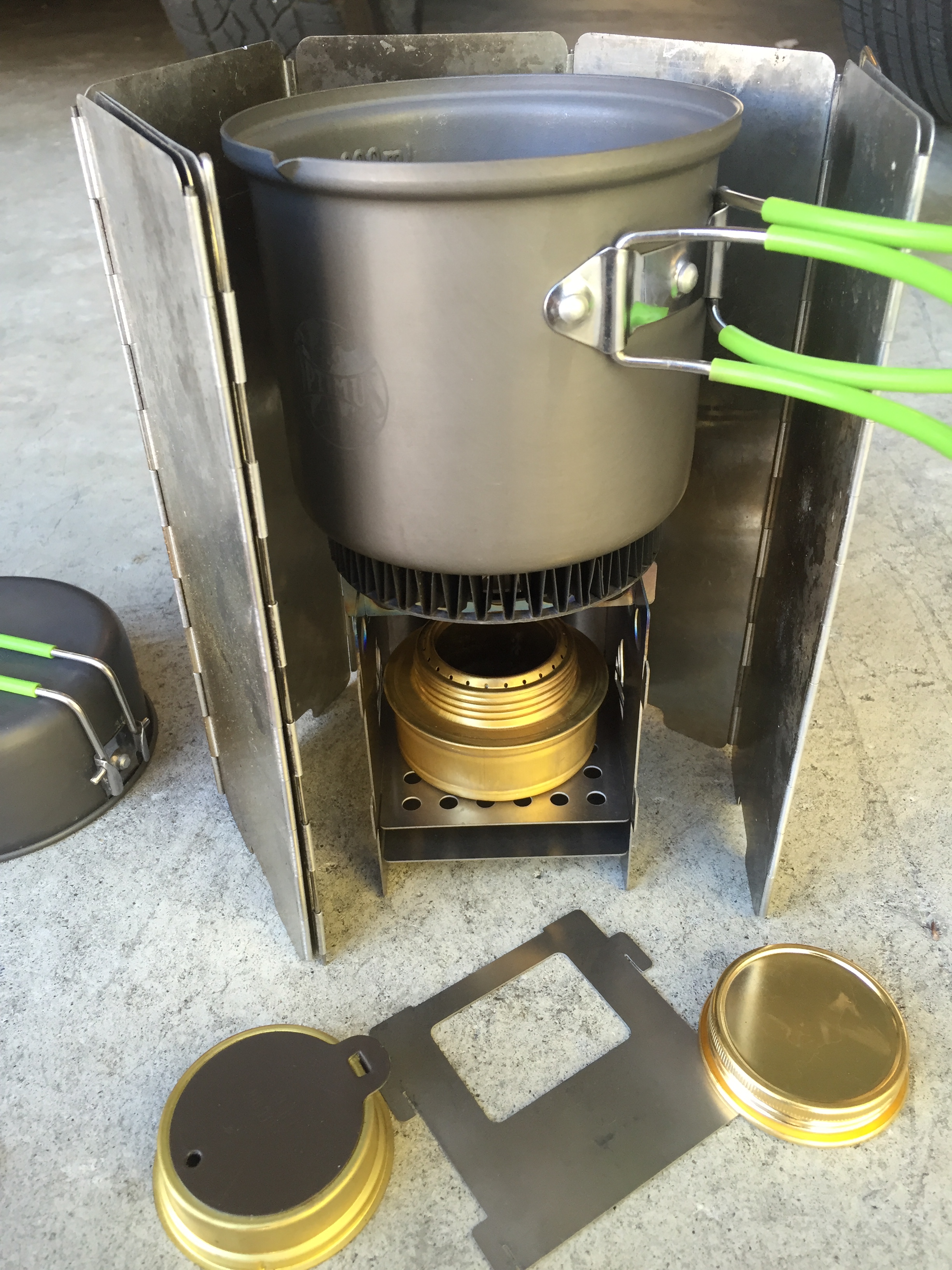 I wouldn’t take this on a two person weekend trip, but on a solo weekend backpacking trip, it one of the best ways to go.  Not quite as light as a JetBoil, but pretty darn close, environmentally safe fuel, stainless and quick evaporating fuel (in case I spill on clothing),  burns clean and reasonably efficient with this setup, and allows for backup fuels.