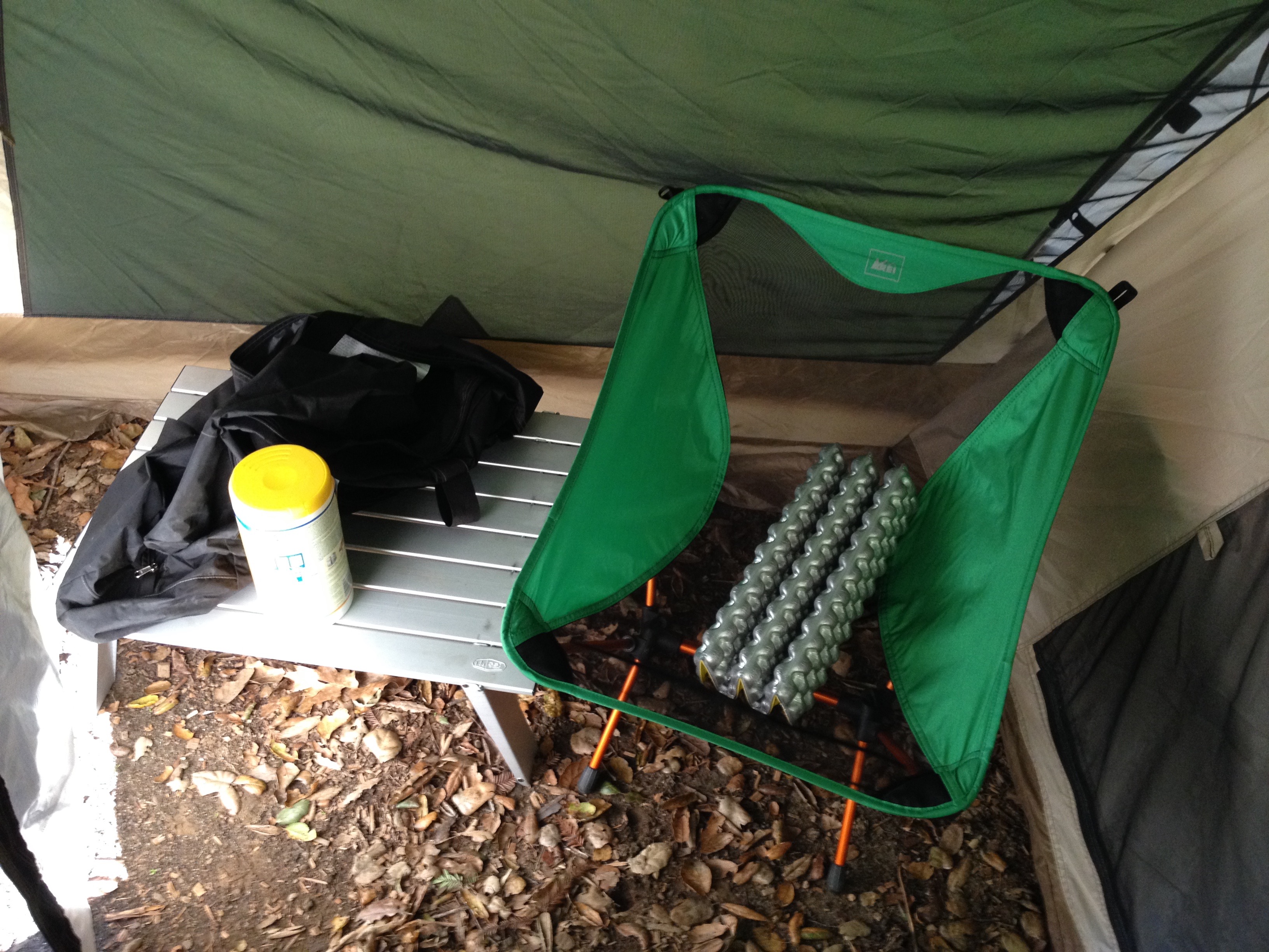 What’s more, to really take glamping in this tent as far as it can go, I usually have another chair and table in the porch. And when it’s stormy outside, this is also where breakfast gets made and eaten. When glamping with a few other friends who each have their own tent which might be smaller, this is also a great place to hang out to get out of the rain. Bring a larger camping table, have one person sitting in a chair in the main tent facing outward with the door fully open, and then a person on each side of the table and a fourth person with their back to the front door of the porch, and it’s plenty of space for 4 around the table for cooking or card games or just chilling. A little hanging lamp and you have a great little lounge.