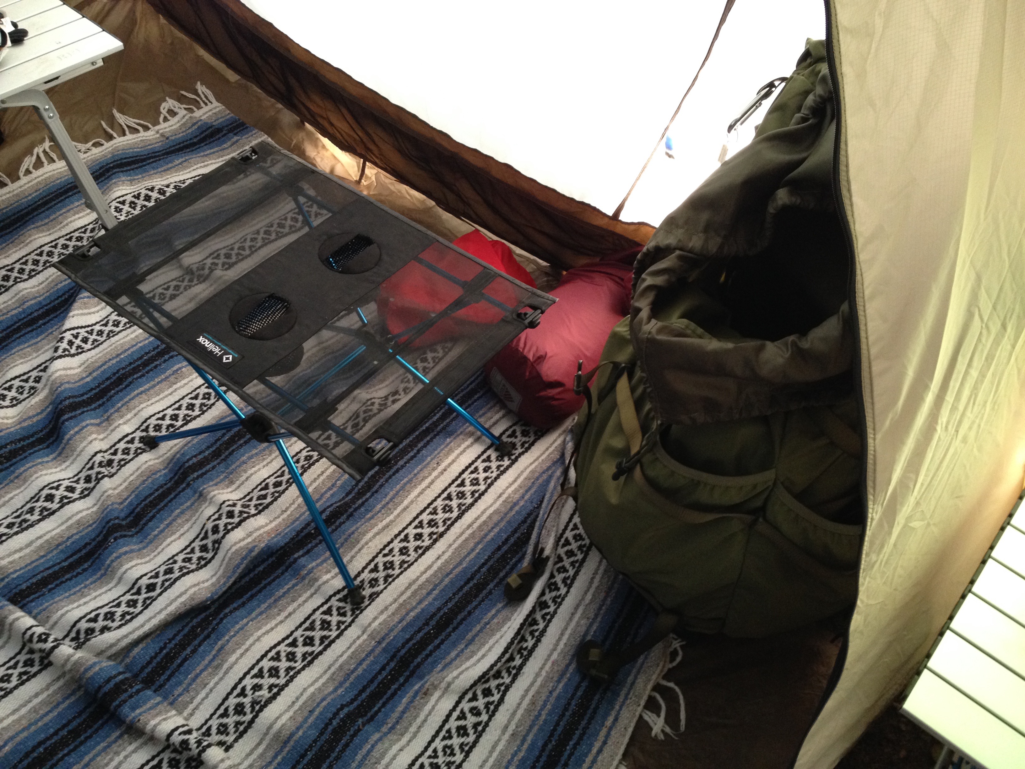 The rear vestibule is also plenty spacious even when the outer rainfly flap is zipped closed. To take glamping another notch up, I sometimes bring a laundry rack, like the kind you see in hotel closets to rest your suitcase on, and leave wet gear on there to prevent it getting wet from the rain soaked and sometimes puddling ground. Is that glamping or what?!