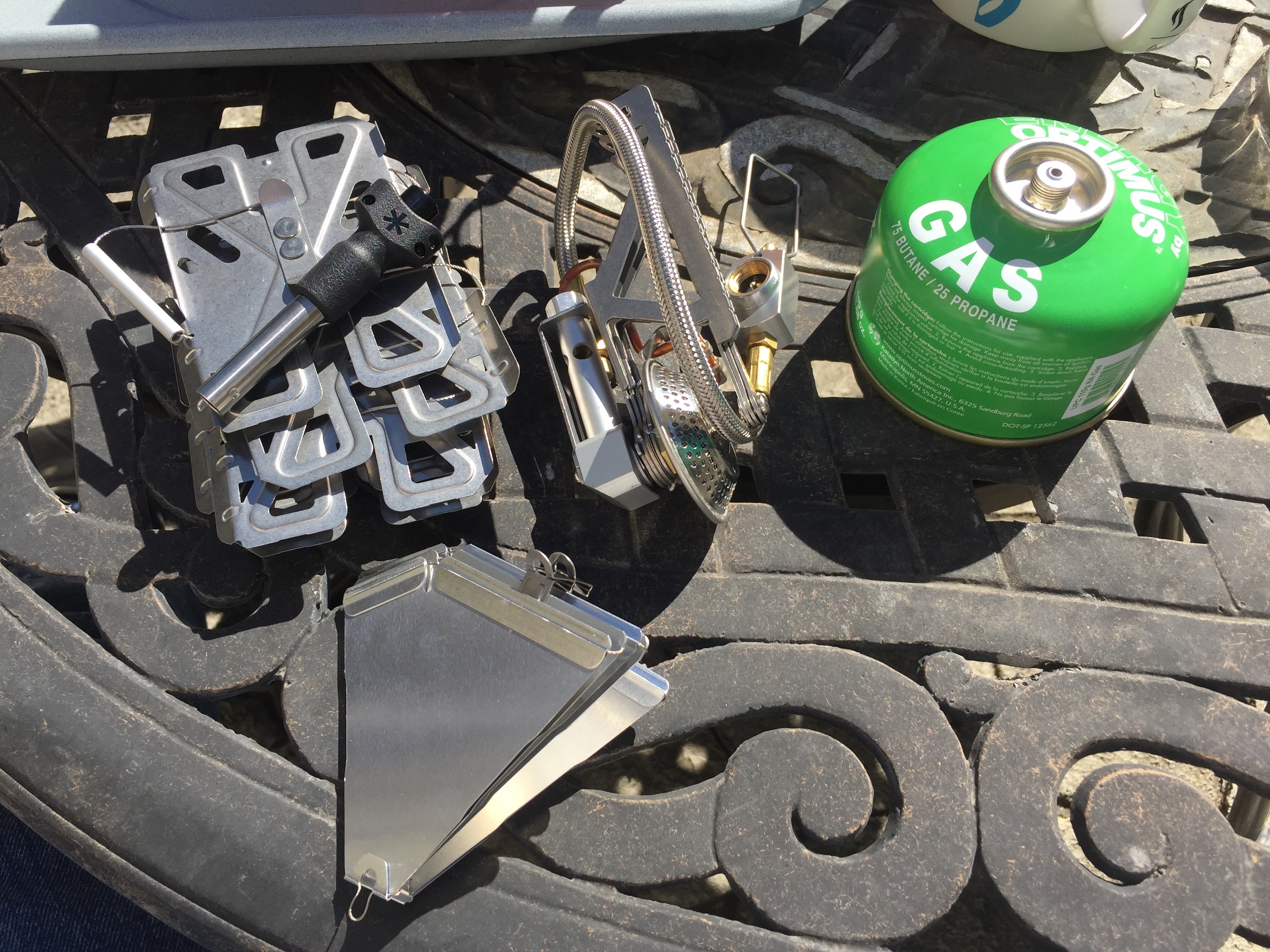 When folded up, the stove/pot stand is about 5″ in length and about 2” in diameter. Which is smaller than the Optimus Vega. But it has two additional pieces (the floor reflector and the windshield/stove legs) which makes the whole thing take more space than the Vega (which doesn’t have these pieces, and is also therefore somewhat less efficient).