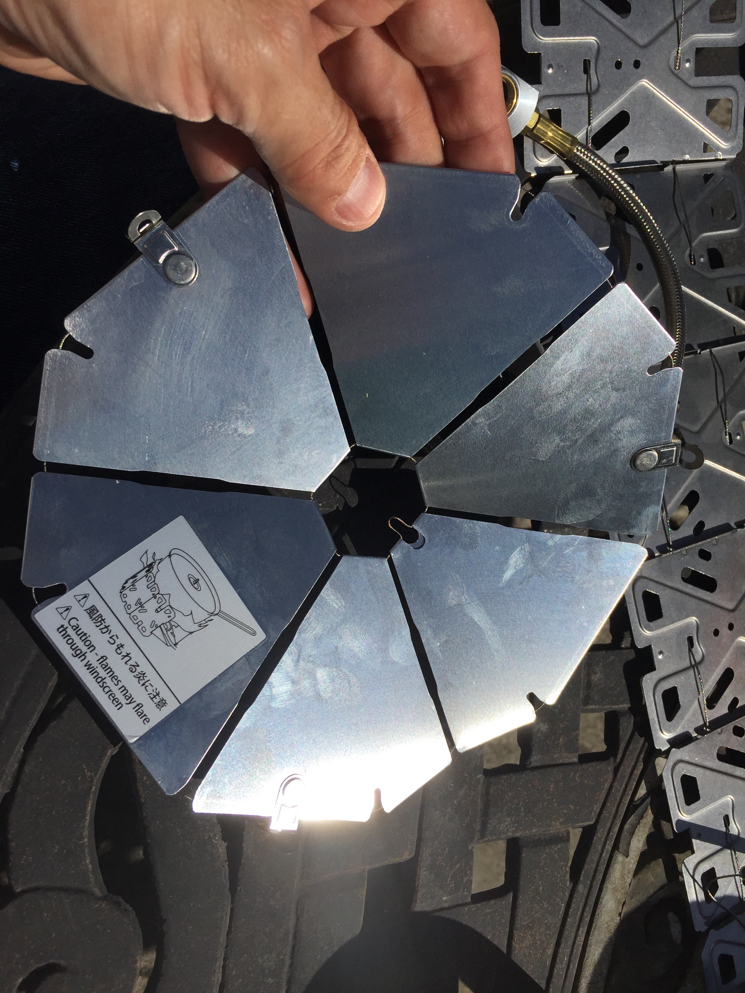 When opened up, the full diameter of the Geoshield is about 8″. Which is pretty huge (also comparable to the Optimus Vega). Plenty large enough for a 6″ cast iron pan, not quite enough for an 8″ cast iron pan because of the angled sides of most pans. Large enough for the x-pot pan, though maybe just a touch too much heat going up the sides. Would need a little testing to be sure. Great for a low-and-wide kettle.