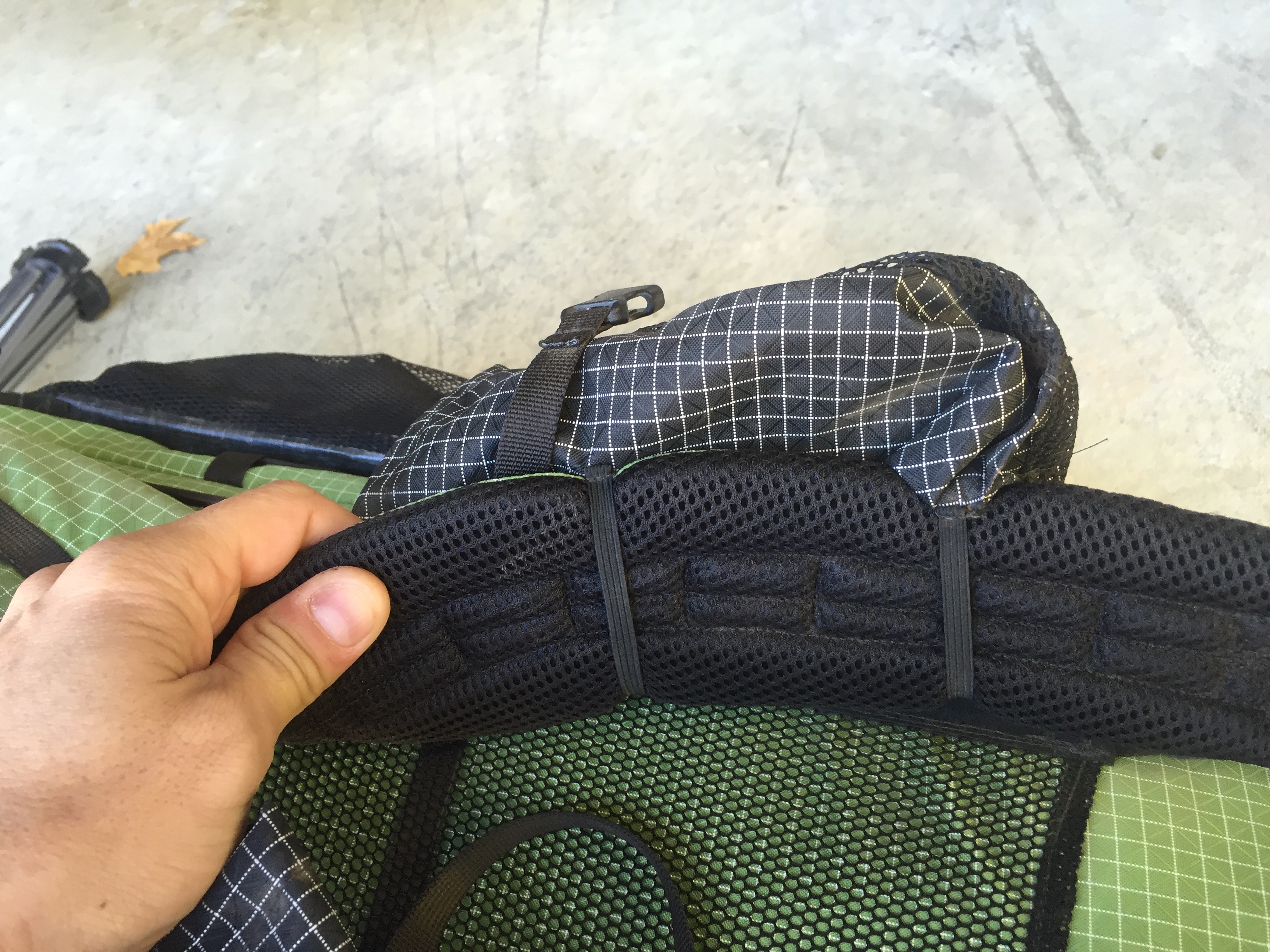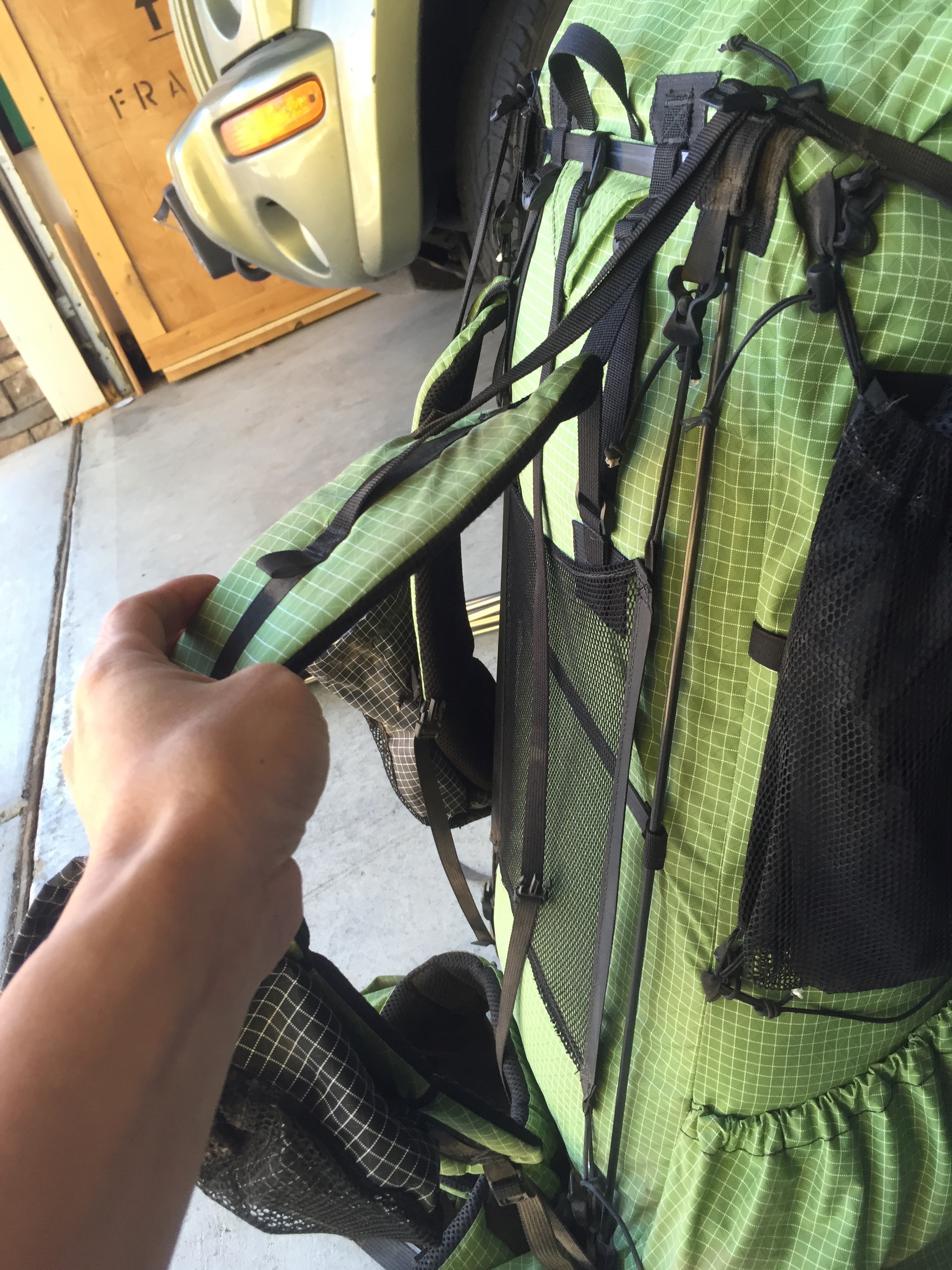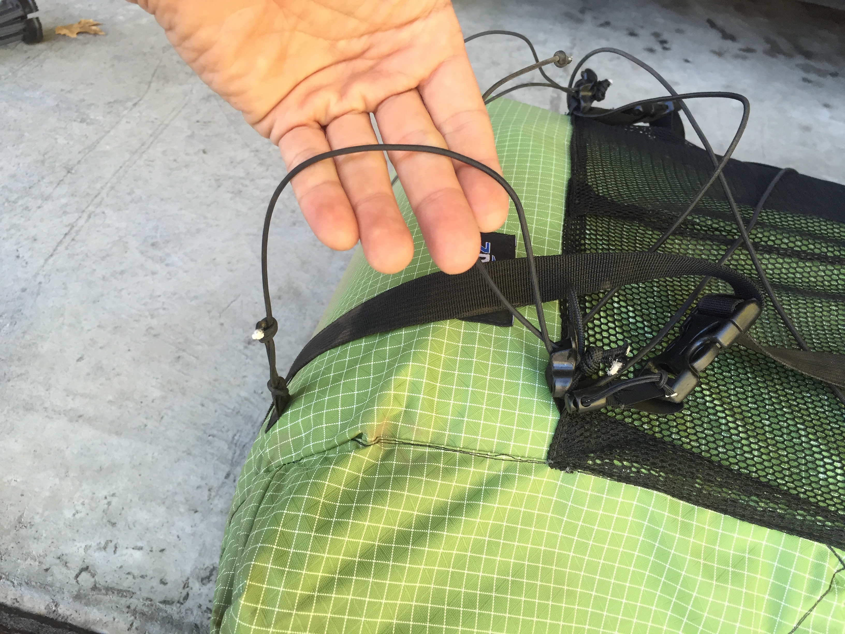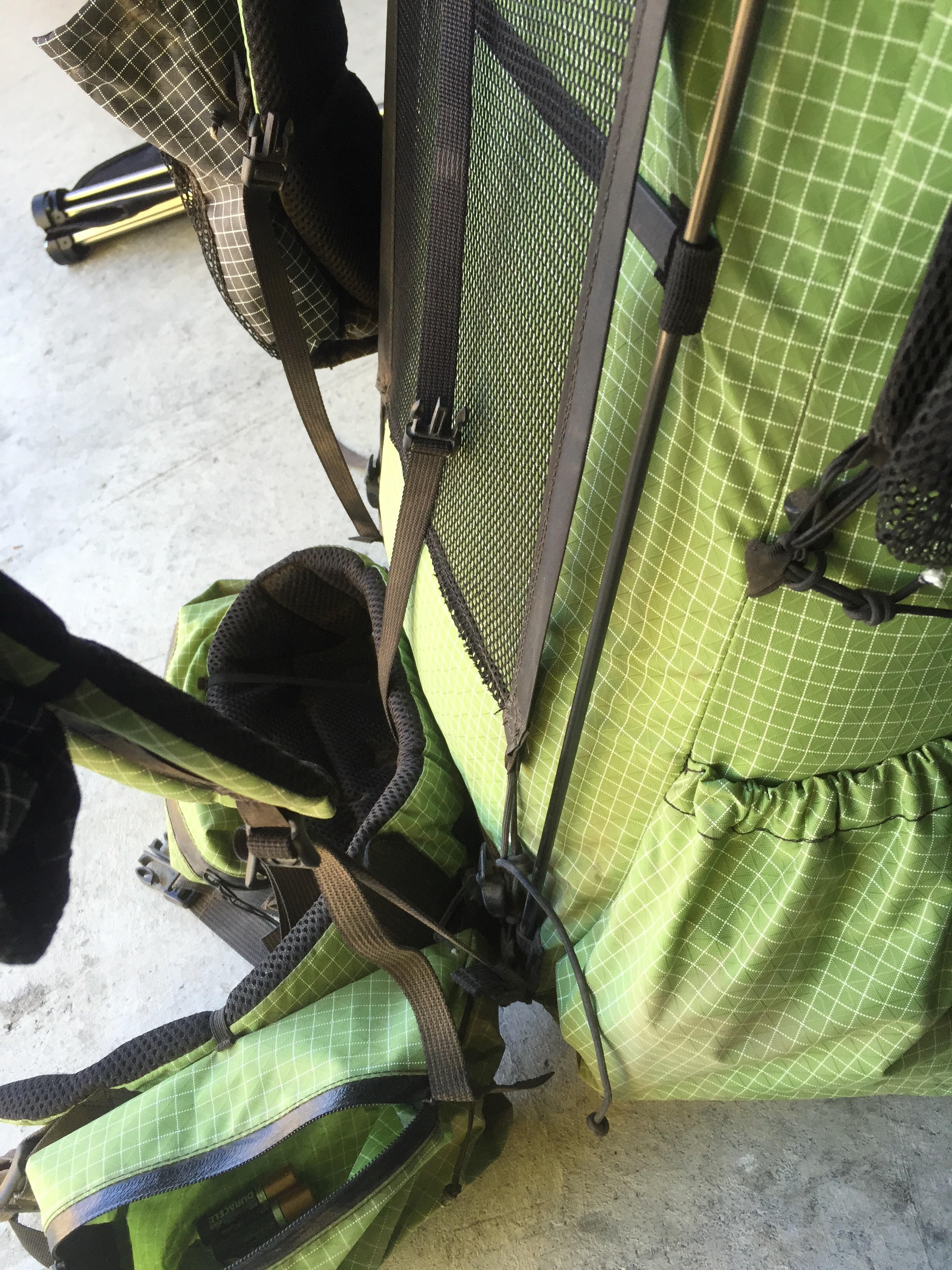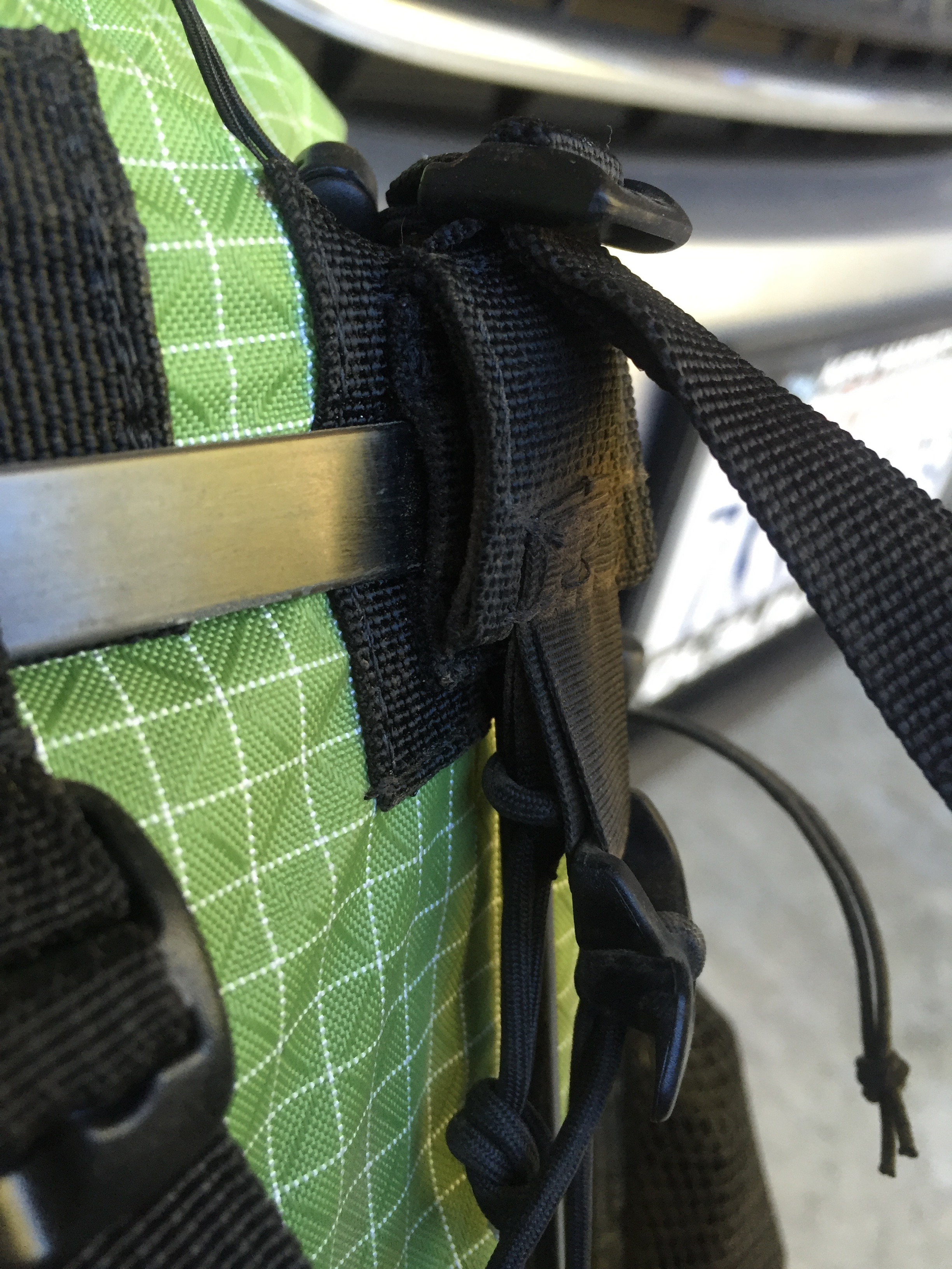 Essentially, the frame consists of two flat’ish horizontal bars, and two vertical rods. these 4 pieces are not welded together. Rather, they gain their structure through nylon fabric and tunnel’ed corners with plastic lash binders. the two vertical rods have enough give that you can curve them slightly and lash-lock it with a plastic cord binding bit, which in turn adds additional tension to the mesh backing, and also pushes the back of the main pack away, creating airflow. Great for warm weather hikes. Overall though, I haven’t found this really necessary, and a straight vertical, without a curve has worked well. I’ve heard of adjustable shoulder straps before, but an adjustable frame is new, and really is a well thought out bit of fabric and frame engineering. Bear in mind though, that the rods are held in place by a nylon foldover mechanism with that plastic cord binder, so make sure to check it once in a while, just in case.
