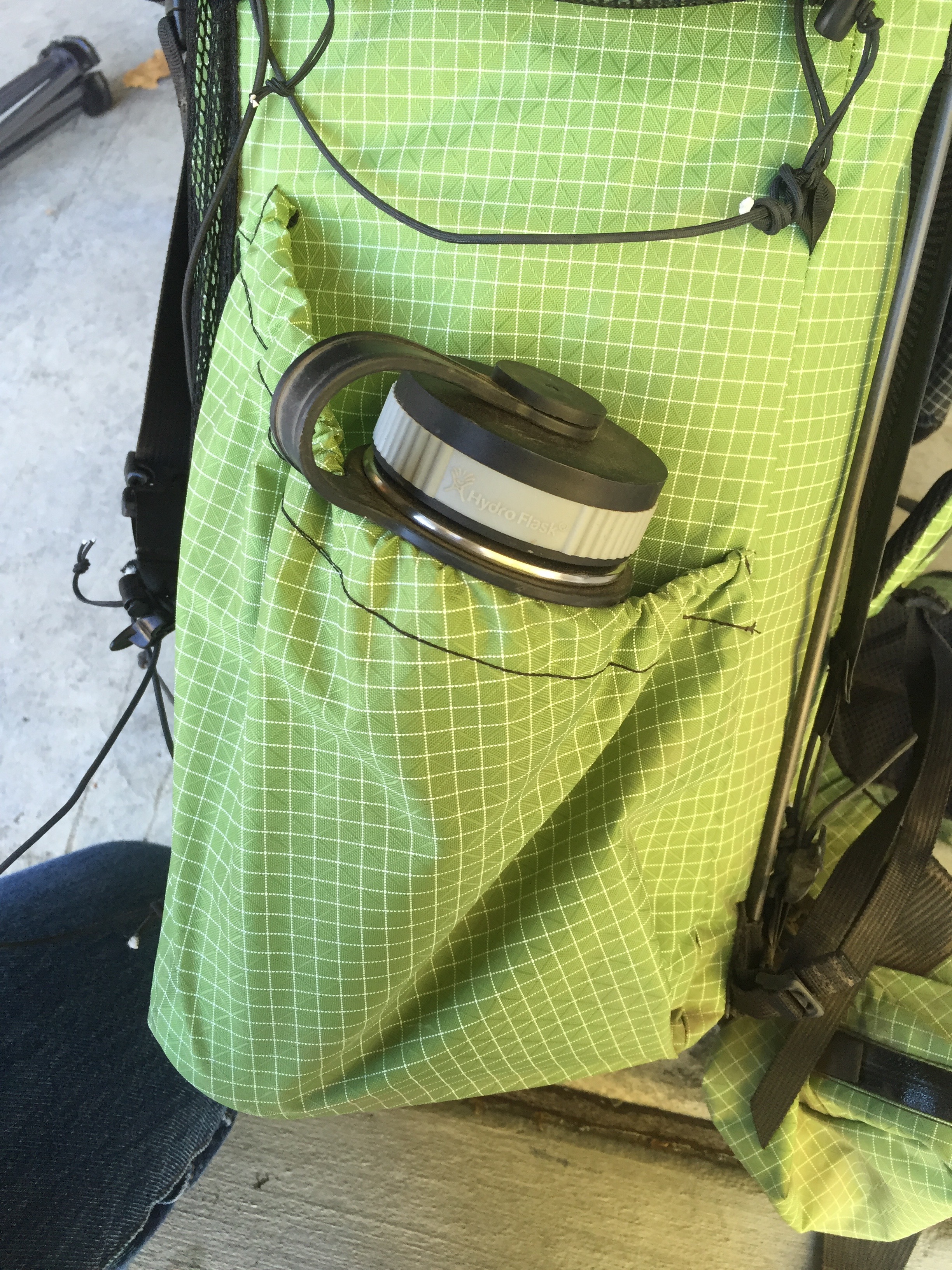 The two side pockets at the bottom are perfect for heavy’ish items. I keep a hydroflask in one, and the venture 30 battery in the other. If I were to carry a liquid fuel stove, it’d probably go in the venture 30 pocket, and I’d move the venture 30 to one of the separately sold accessory pockets. For dry backpacking trips, I’d probably put two large water bottles in these pockets instead.