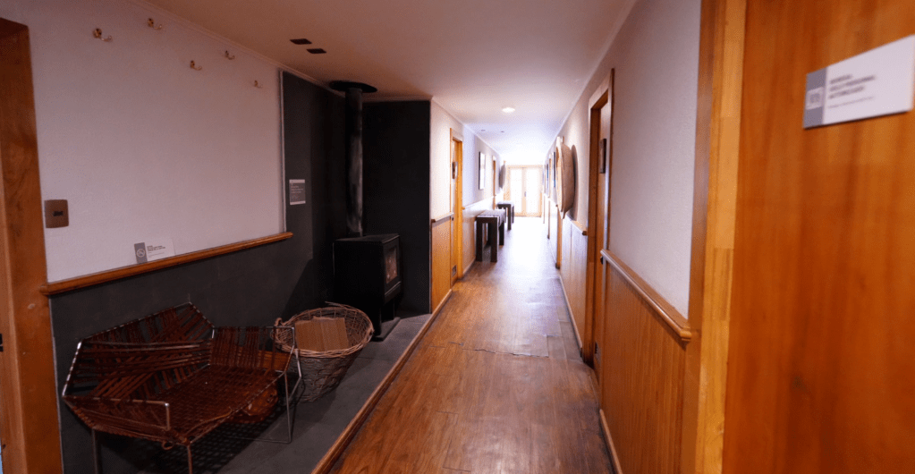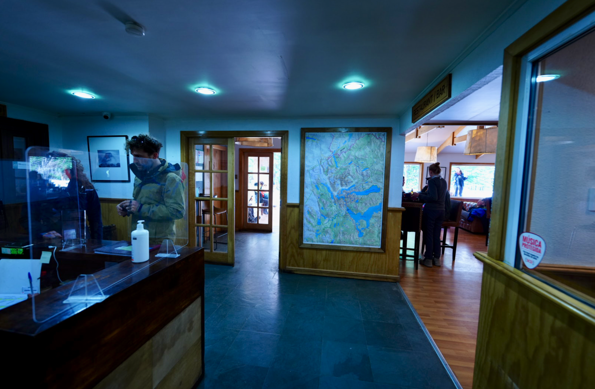 Once inside the main Refugio Grey entrance, there is a weather break hallway with a second set of doors, and then the checkin counter. The photo below is taken from near the back of the building, right next to the main checkin area, facing the main entrance. You can see a bit of the restobar to the right, and the doorway on the left leading to the bunk area.