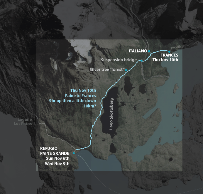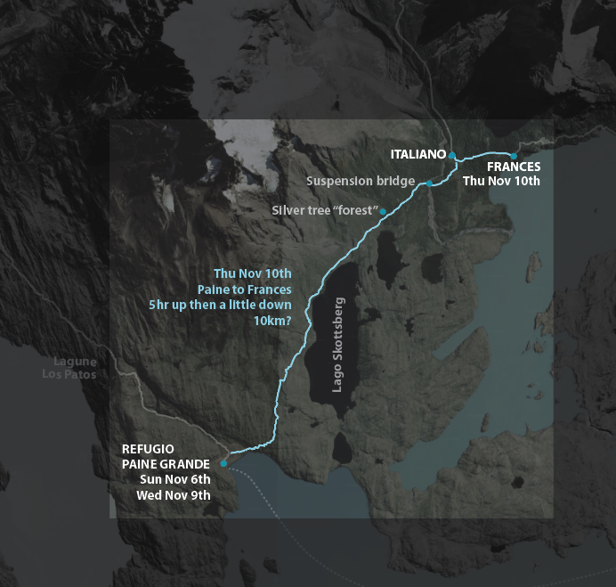 She seemed a little tired, but glad to have some chill time. Tabea had left Paine Grande earlier than us, and went up to Britanico, dropping off her pack at italiano at 10:30am before the trek upwards, and arrived at Frances by 4:30pm. Not too dissimilar to our plans for the following day.