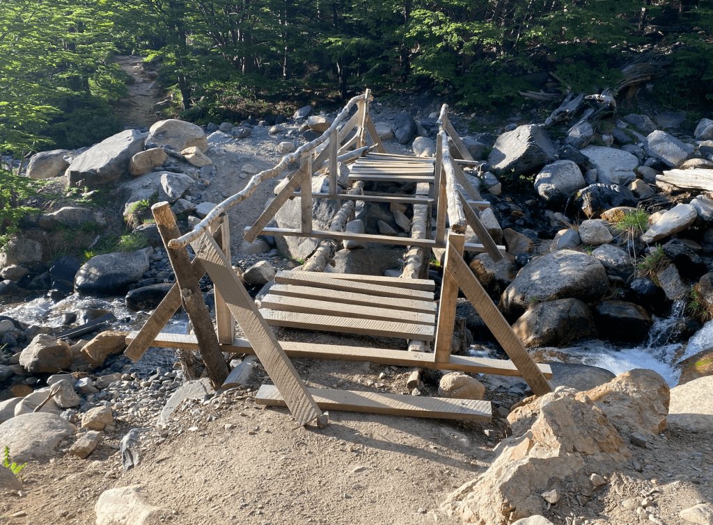 The stone lined pathway in the photo below leads to Refugio Central, where there is a dining hall/restobar, additional bathrooms and showers, and other facilities. There must be a wide yet shallow stream that runs through here at the beginning of the season.