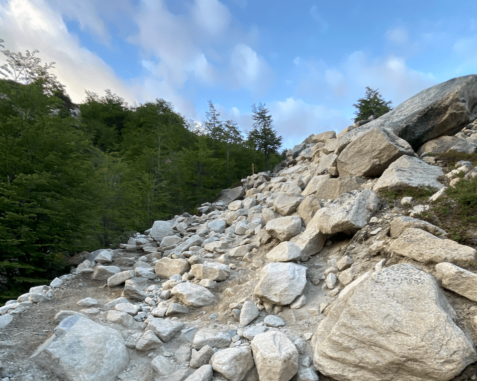 And then suddenly, the trees ended. The path opened up to a steep skree landscape with a brutal climb where the path wound left and right across large rocks, switchbacking a route that was difficult to tell. The rocks required jumping from rock to rock in some places, with some boulders larger in diameter than a person.