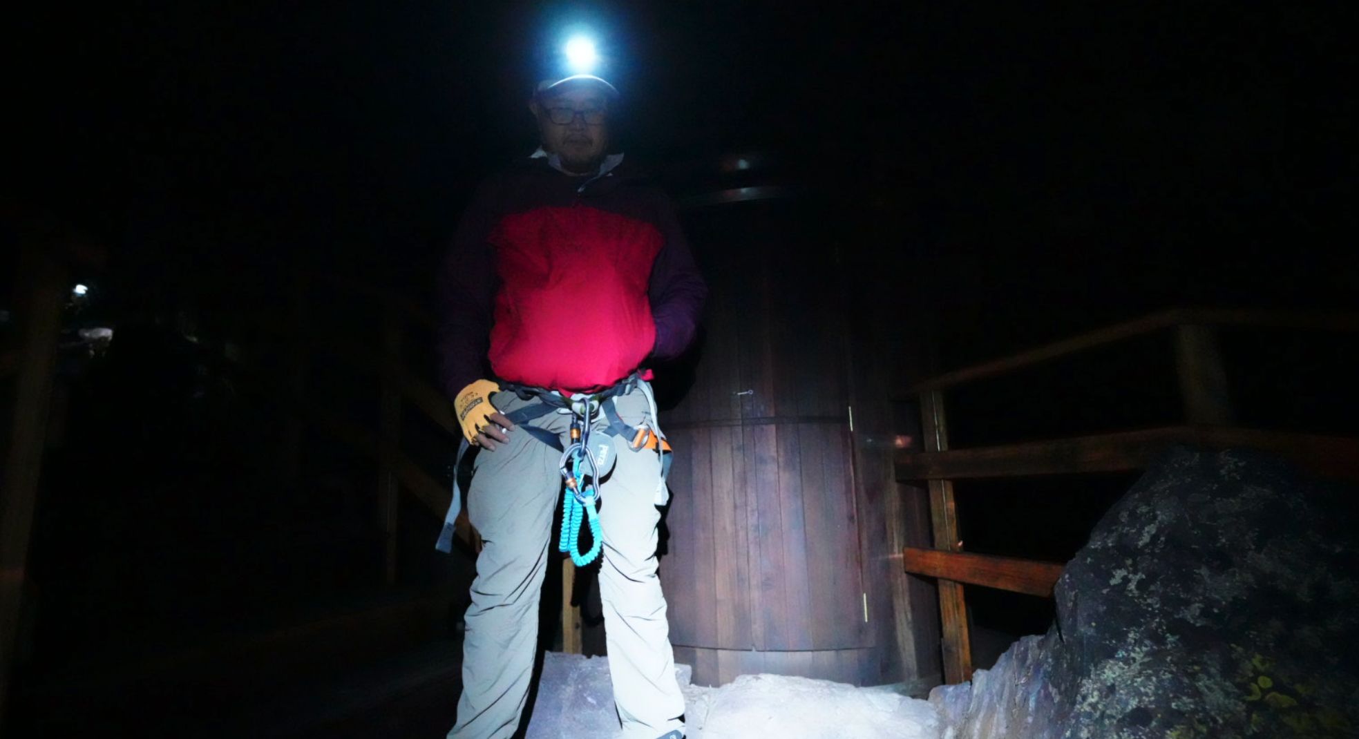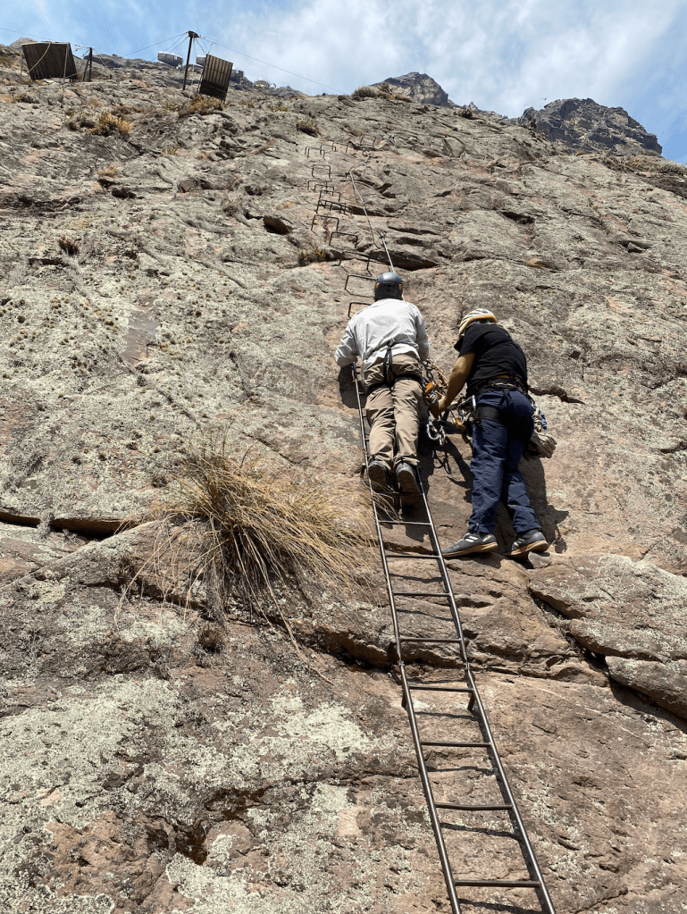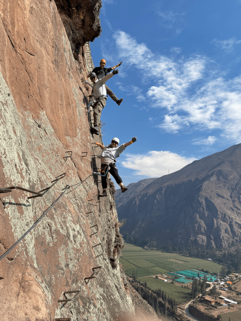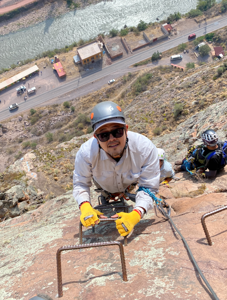 The handholds bolted into the cliff are fairly close together, so muscles aren’t needed to do the climb. The easy thick gauge handholds also pretty much eliminate the need for finger strength. So this isn’t like climbing at all. If fear of heights can be overcome (or isn’t a problem to begin with), anyone can do it regardless of fitness level or age.