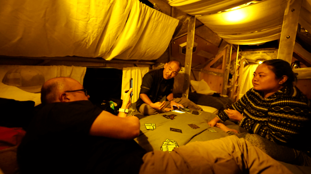 And finally, we climbed the steps bolted into the cliff to get to our capsule. Given the darkness and knowledge that a fall would be deadly, I don’t have any photos of the night climb, but once in the capsule, we settled in and got comfortable, playing a short game of Poison and then bunked down for the night.