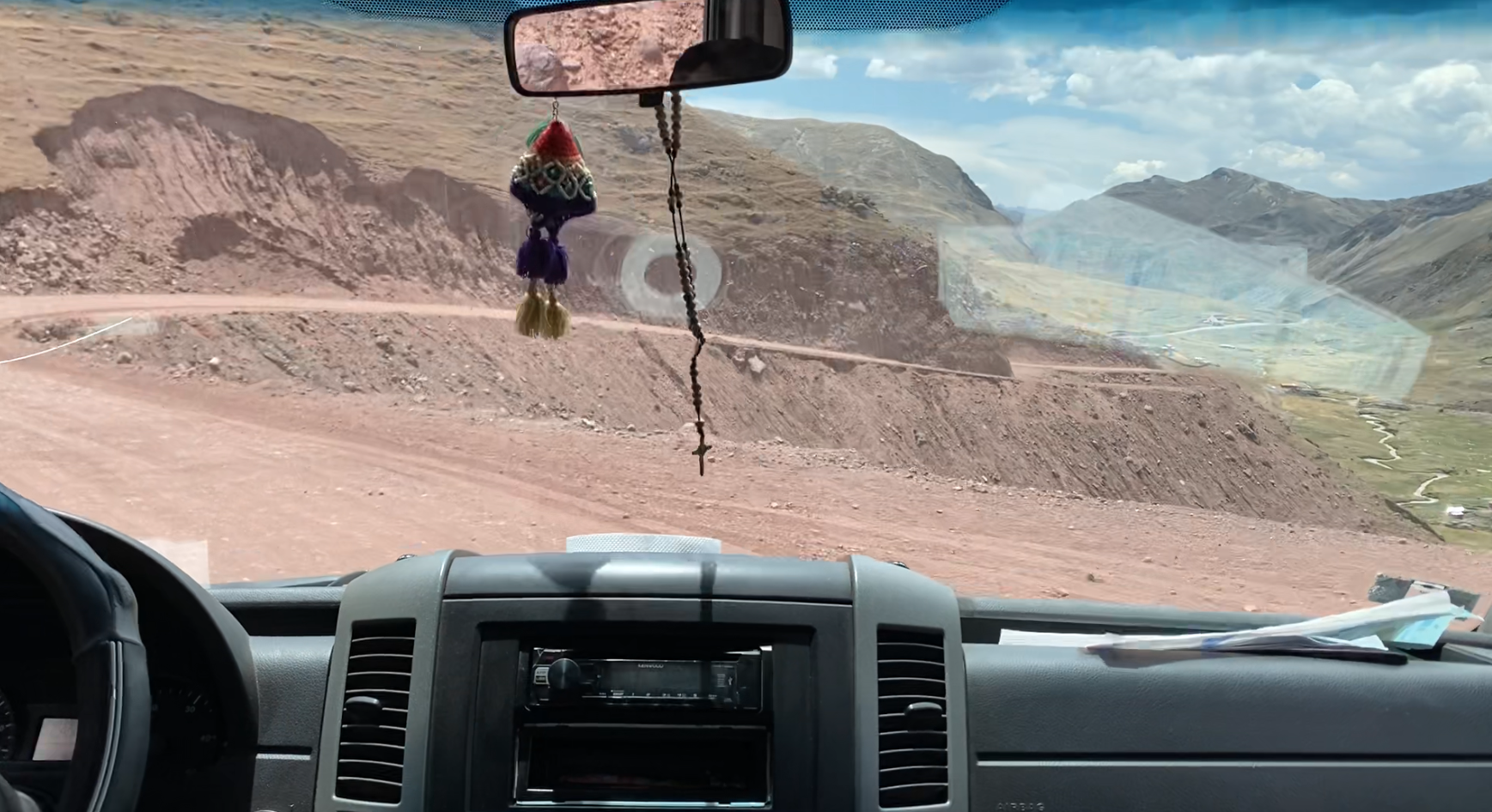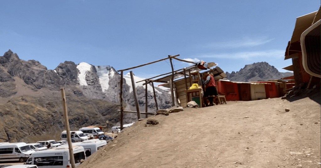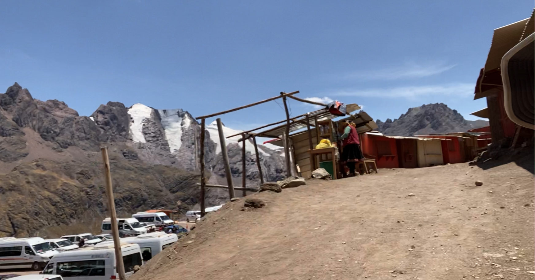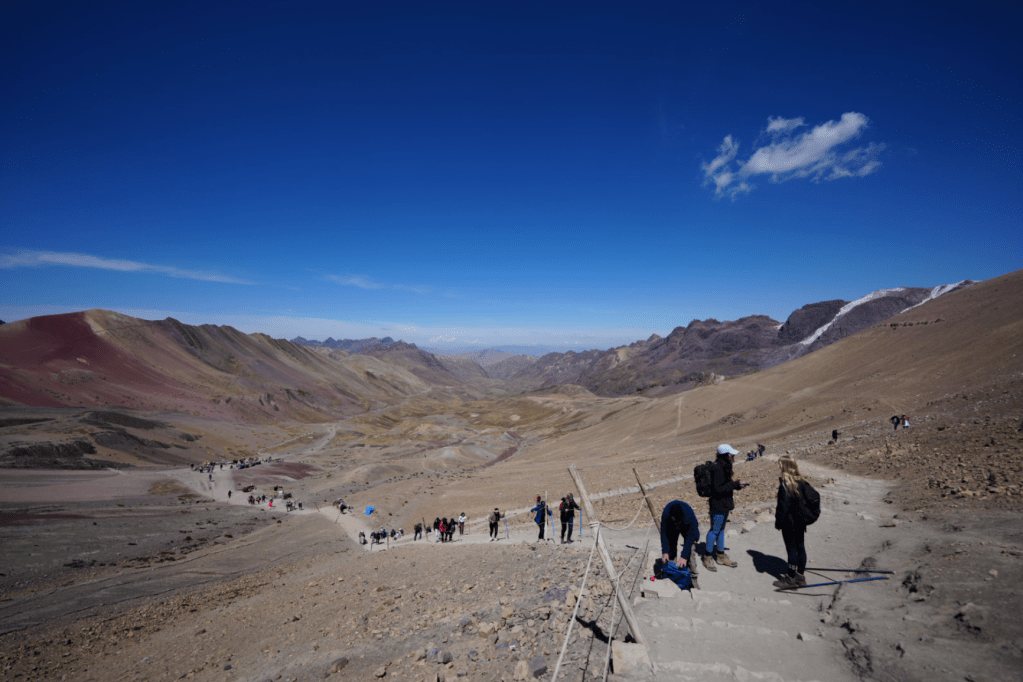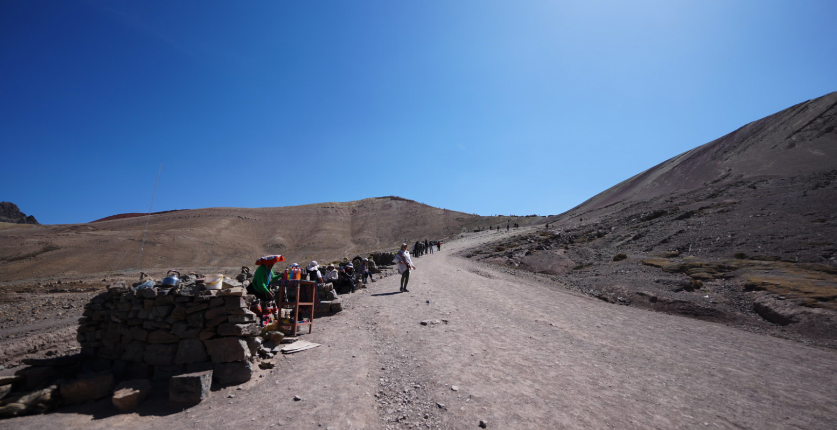 In the photo below, it’s hard to tell, but you can see where the road veers to the right and goes to this dipped part of the ridgeline. That dipped part of the ridgeline is where everyone takes their Rainbow Mountain photos. From that dip, if you go left, you can see the peak that it climbs up to. That peak is the Vinincunca (or Vinikunka) Peak.