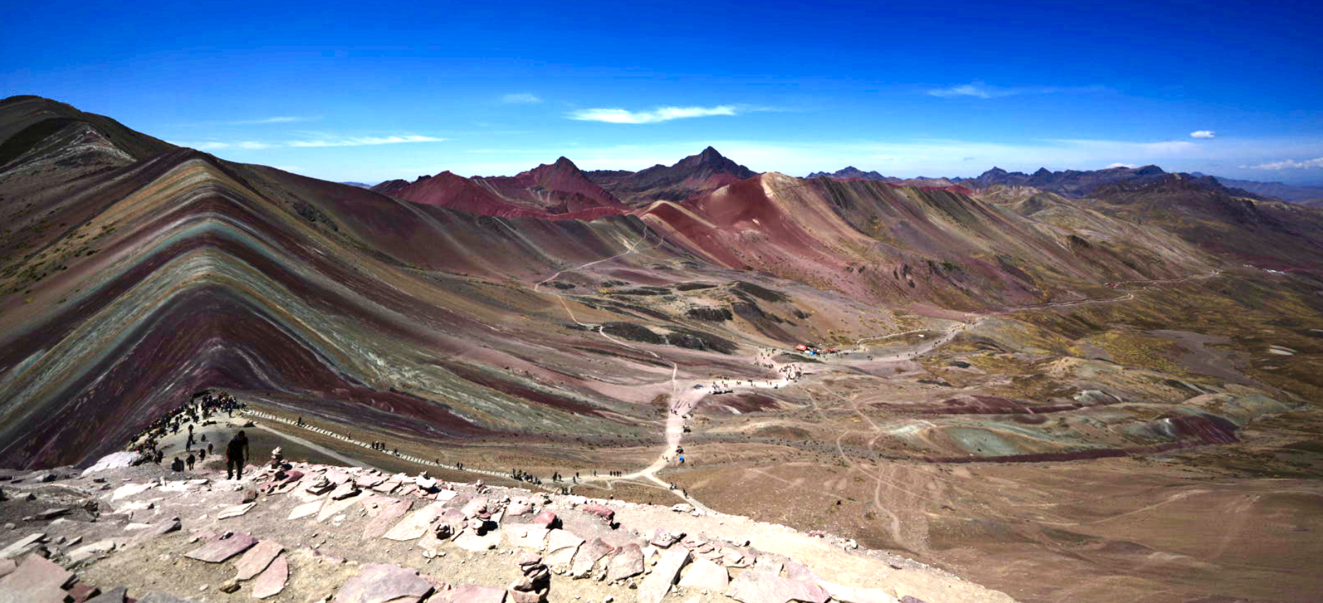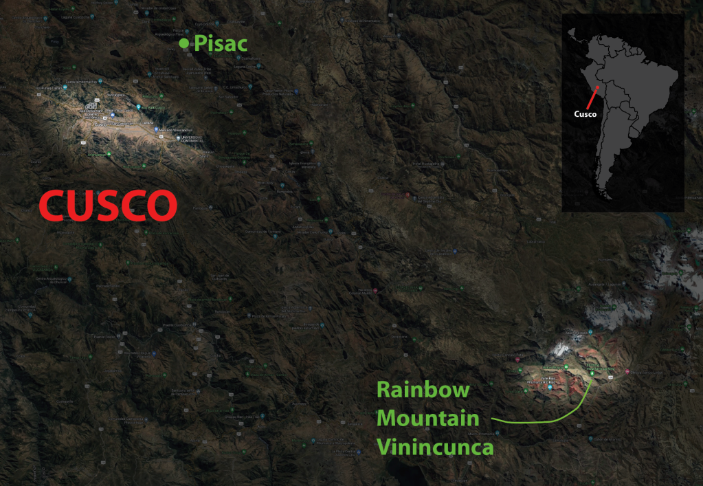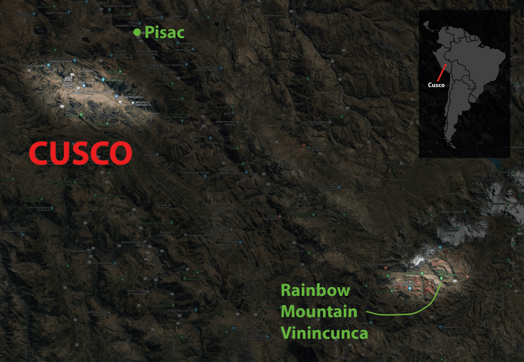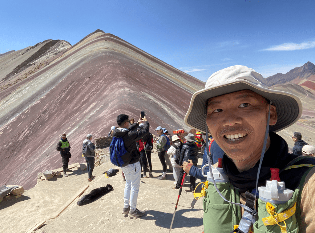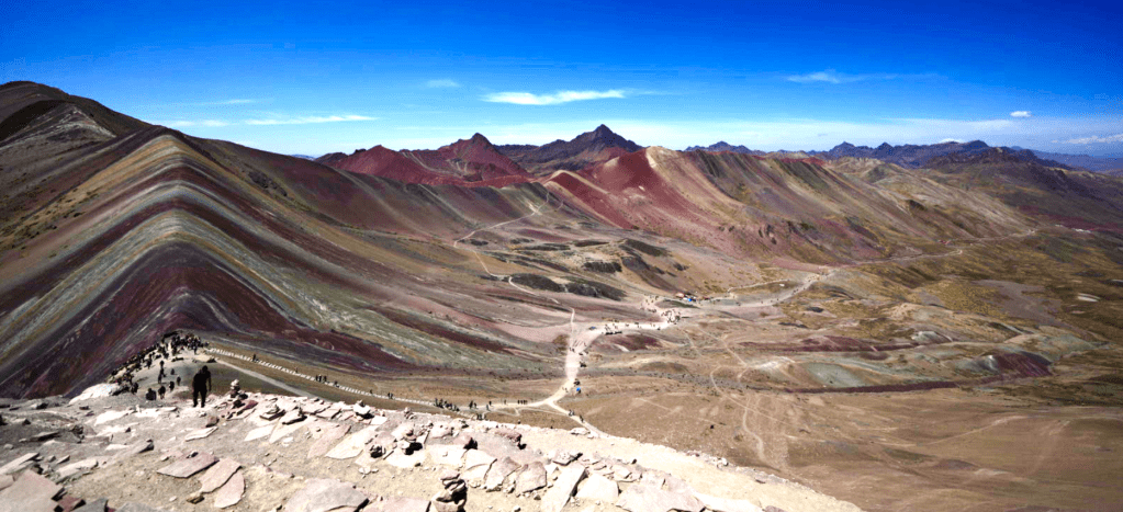 In the photo below, it’s hard to tell, but you can see where the road veers to the right and goes to this dipped part of the ridgeline. That dipped part of the ridgeline is where everyone takes their Rainbow Mountain photos. From that dip, if you go left, you can see the peak that it climbs up to. That peak is the Vinincunca (or Vinikunka) Peak.